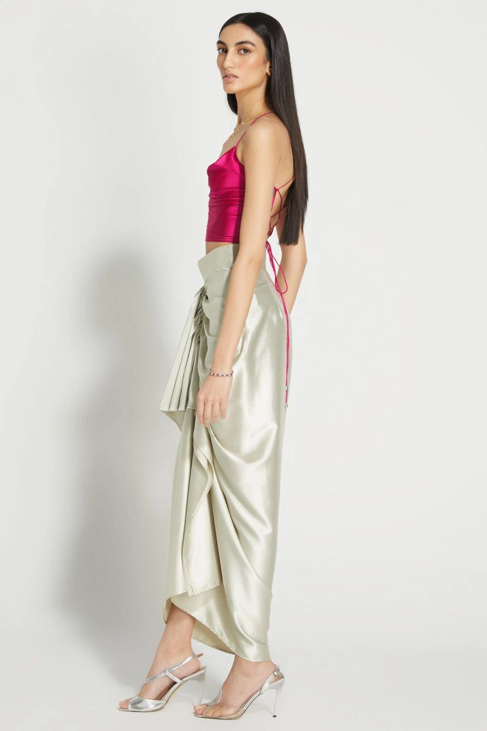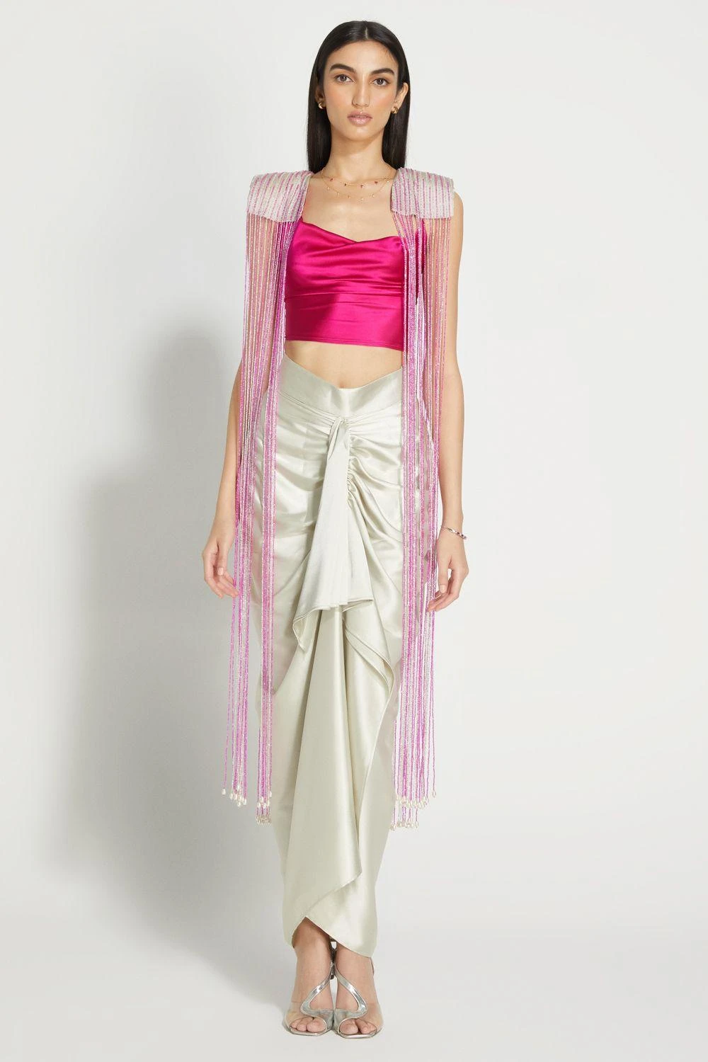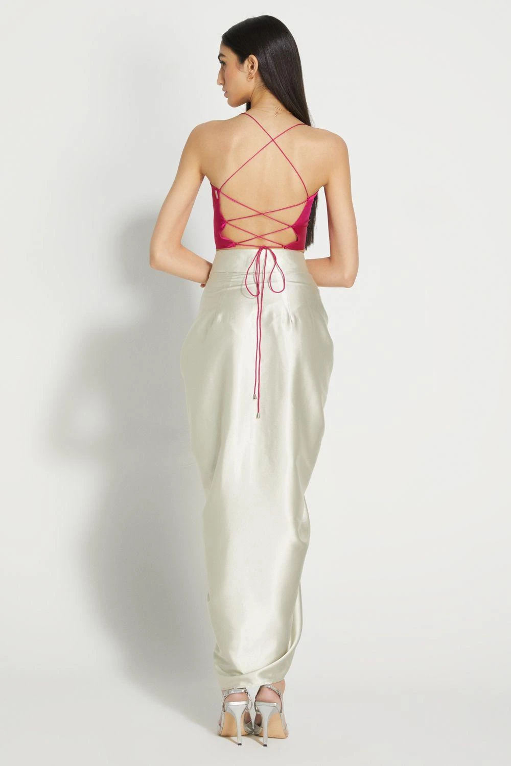 Draped in luxe silk satin, this fuschia top is crafted with a flirty cowl neckline and a completely open back that gives it the right amount of drama. Pair it up with a draped sari for that extra flair or a simple pair of jeans.