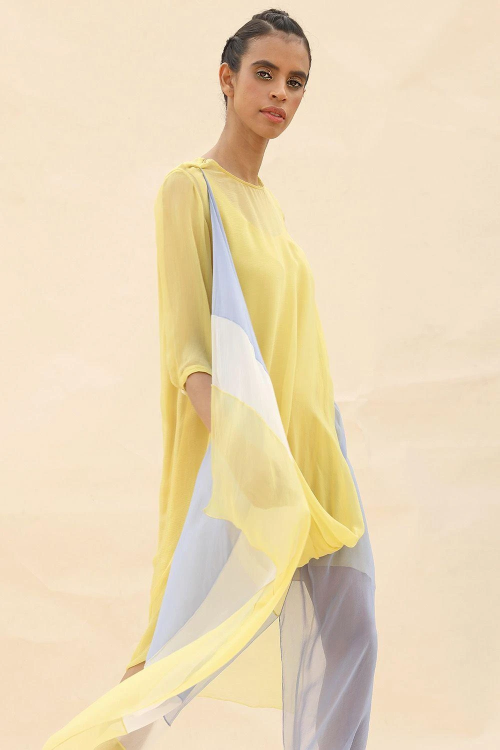This sunflower yellow colour blocked chiffon cowl draped dress comes with a moss crepe contrast slip. This one of a kind pice is perfect for the summer, style this with delicate earrings & bracelet to complete the look.