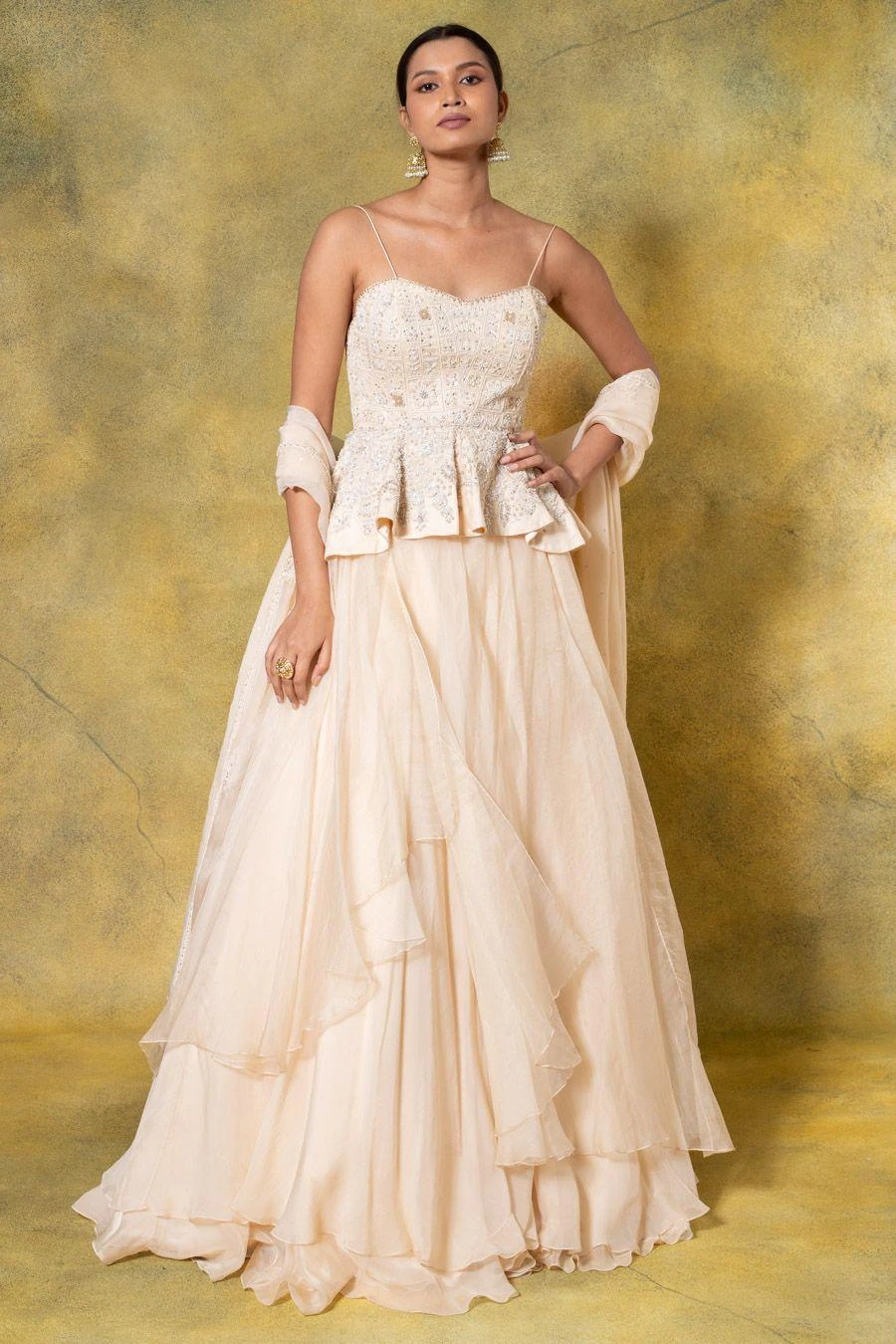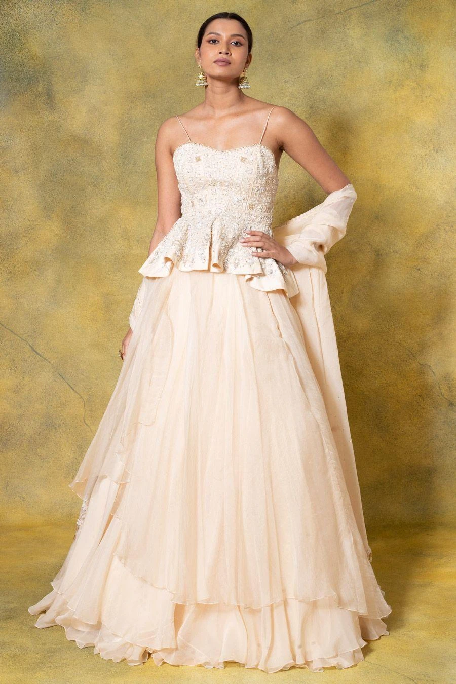 Summer festivities call for easy-breezy outfits like this lehenga set. This set features a floral embellished peplum paired with a lehenga & dupatta. You can team it up with a pair of elegant statement earrings to complete the look.