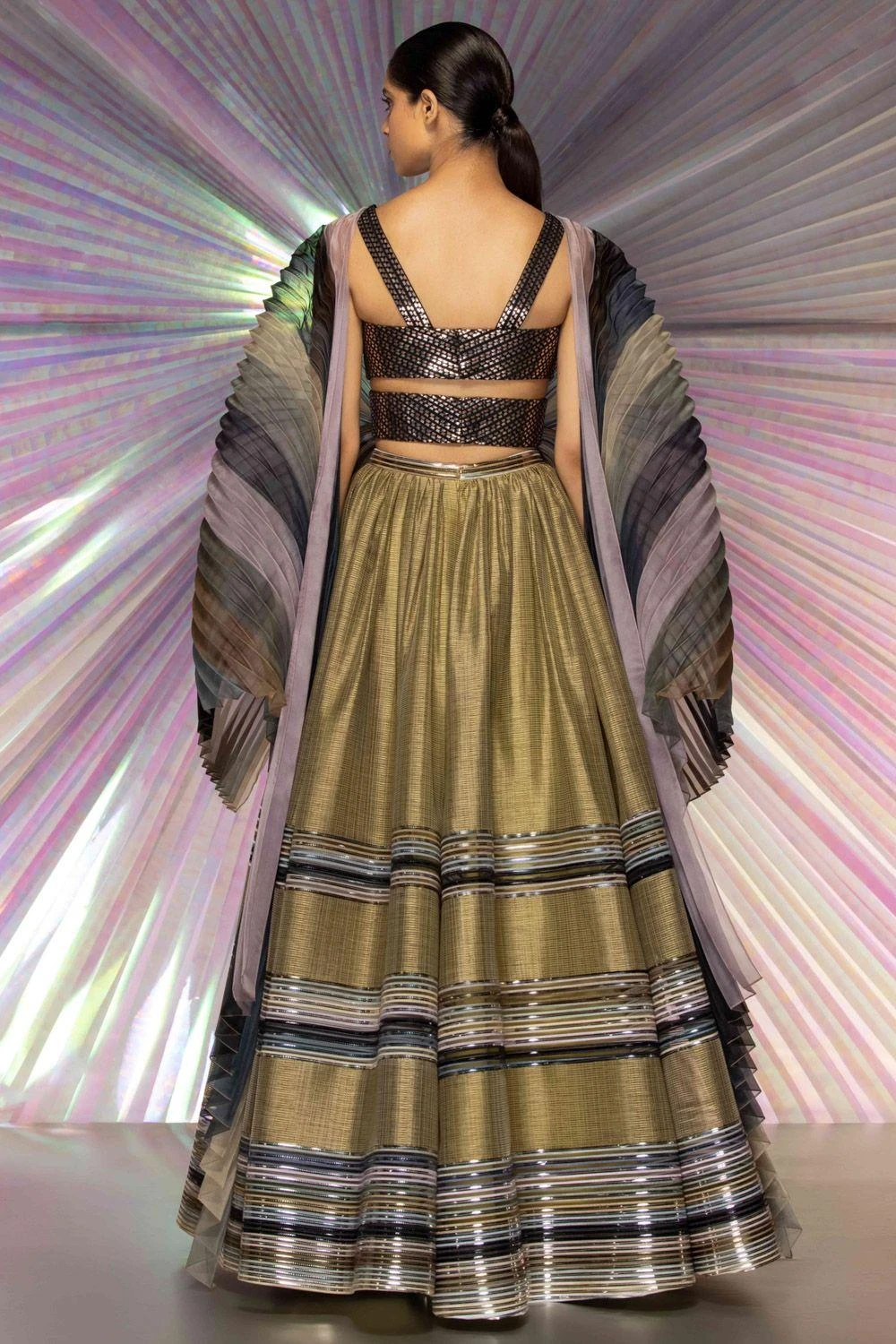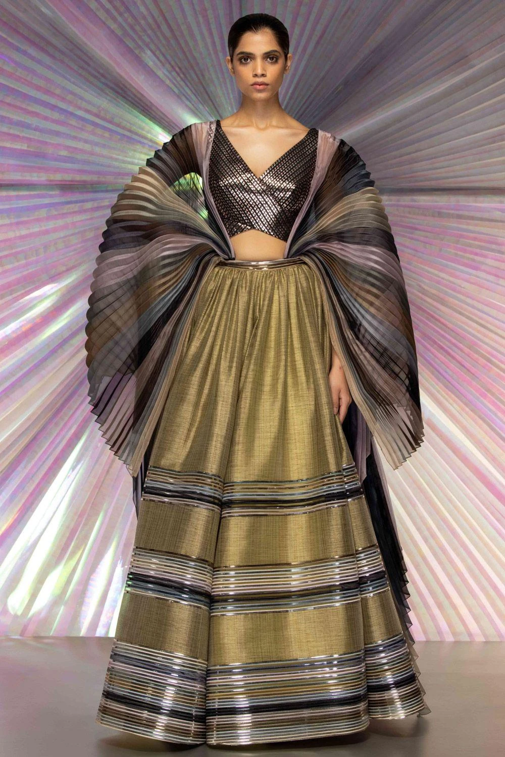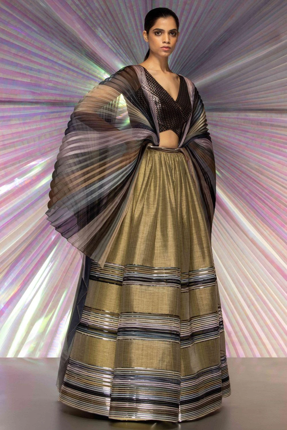 Indian couture takes on a whole new meaning with this avant-garde olive ensemble. It features a gathered striped lehenga, paired with metallic moulded hand woven blouse in polymer and a unique plisse drape which finishes the look.