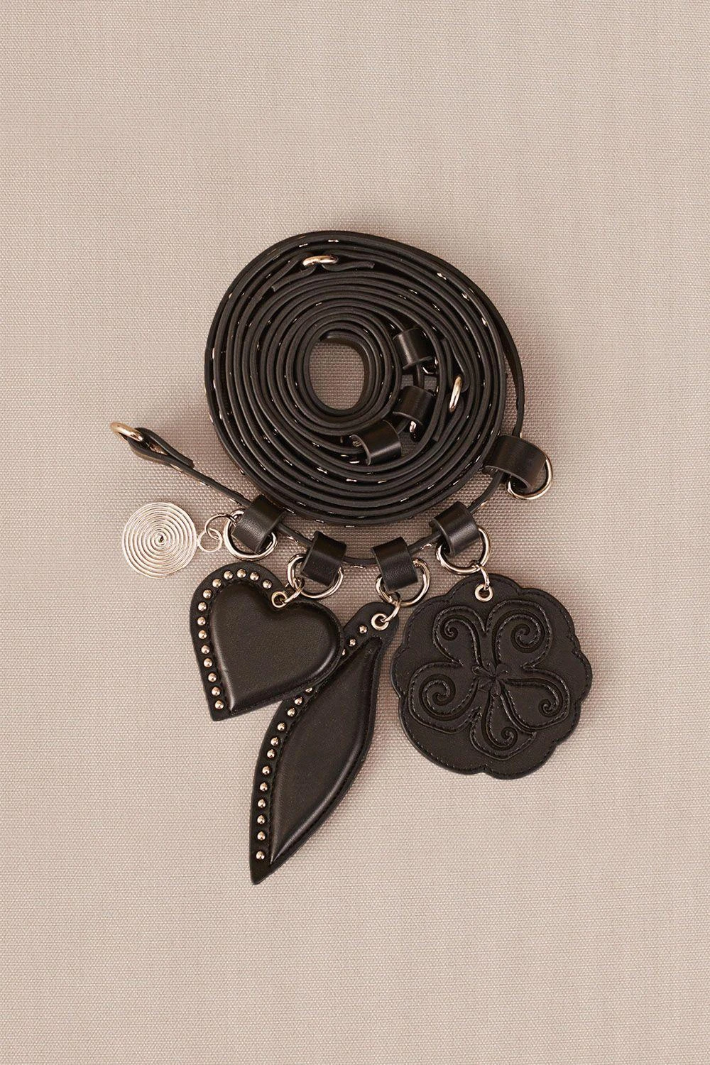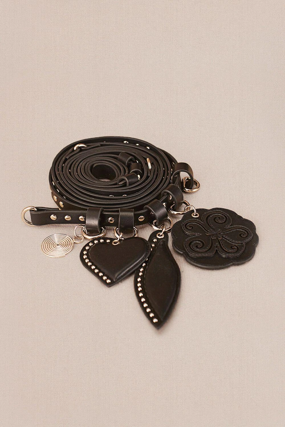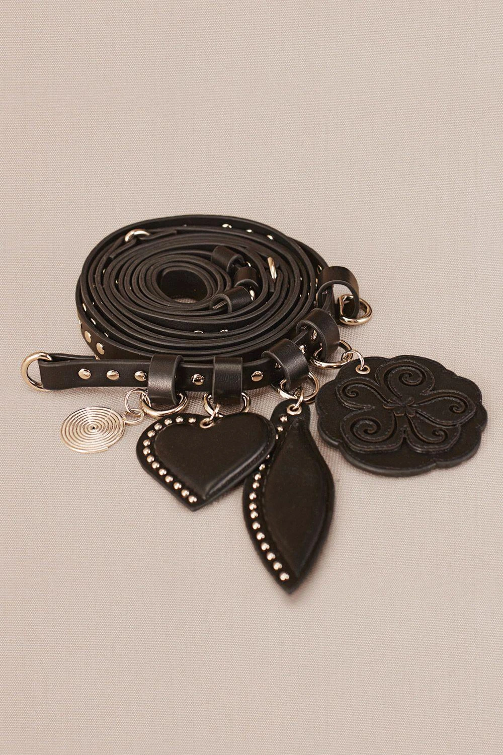 Amplify style with Aafia, a triple wrap belt featuring laser cut studs and gold-plated spiral charms. Elevate your ensemble effortlessly with this chic and intricately designed accessory.