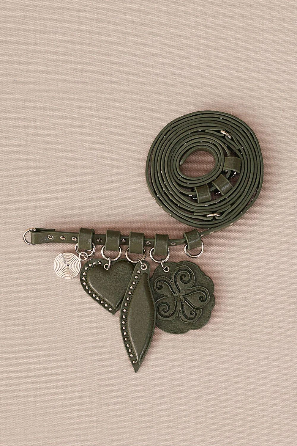 Discover elegance in Aafia’s olive triple-wrap belt adorned with laser cut studs and gold plated spiral charms. Elevate your fashion game with this chic and intricate accessory.