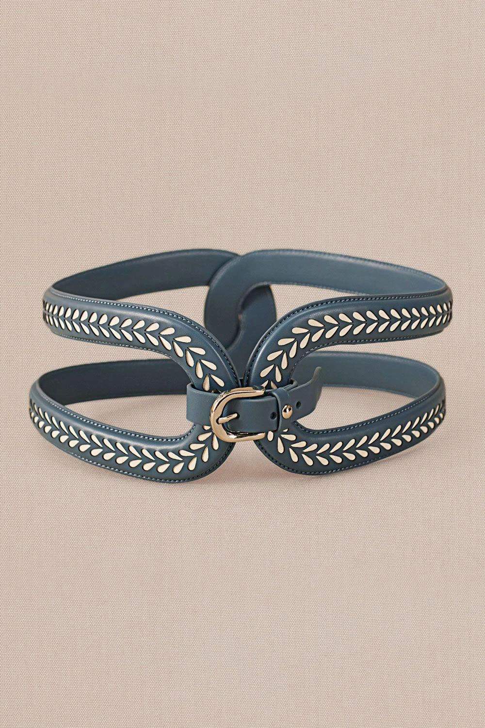 Elevate style with our finely crafted faux leather Adara smoky corset belt, featuring laser-cut details, silver rivets, and a frontal buckle. Unveil sophistication effortlessly