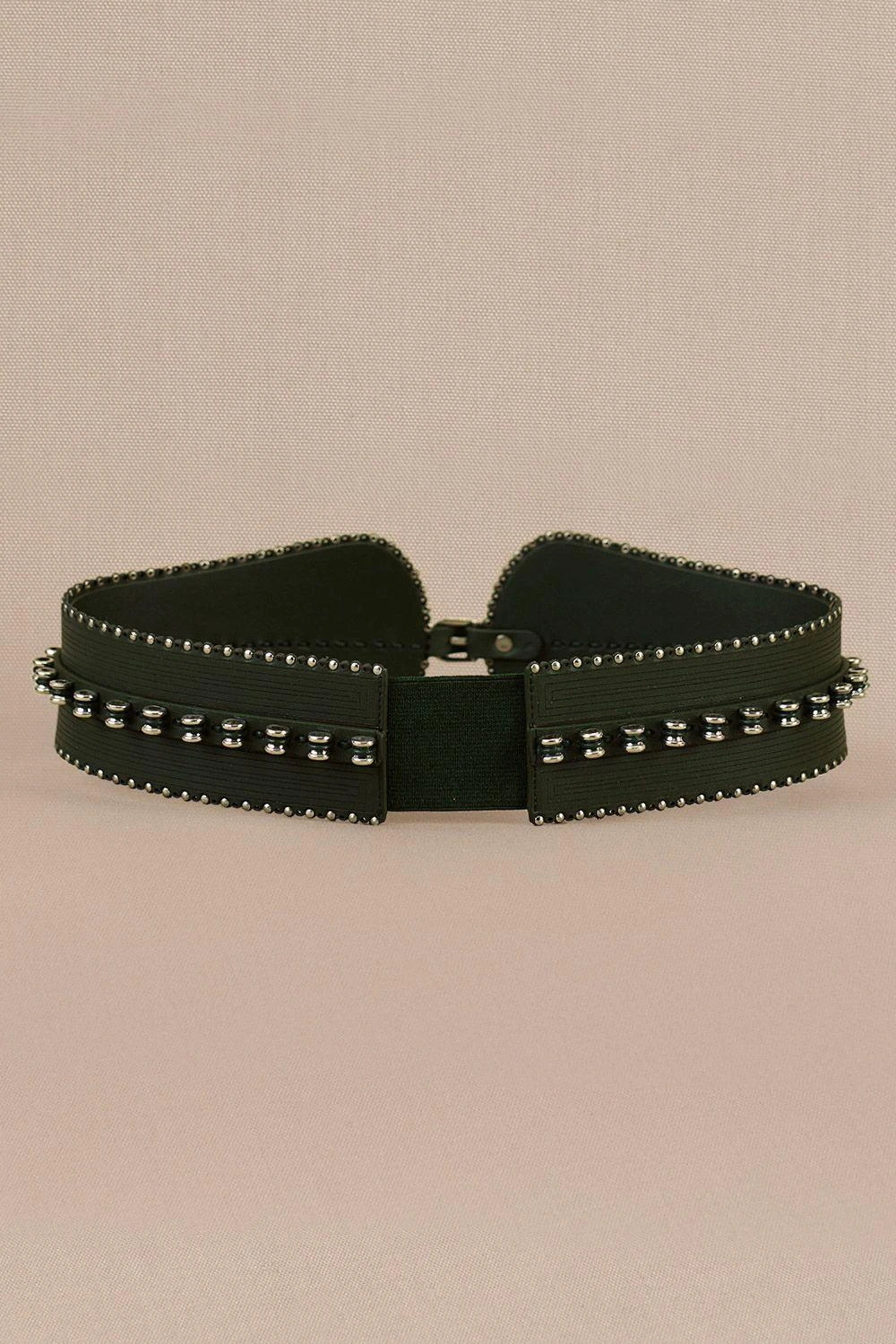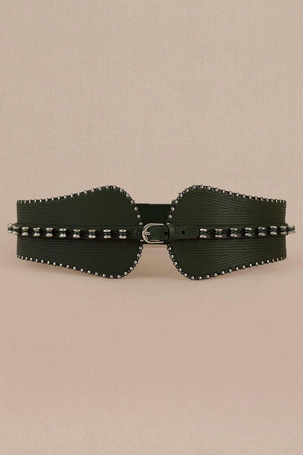 Elevate your look with a laser-cut corset belt in lush green faux leather. Adorned with a front buckle, this delicate accessory adds an enchanting touch of sophistication and flair to your outfit.