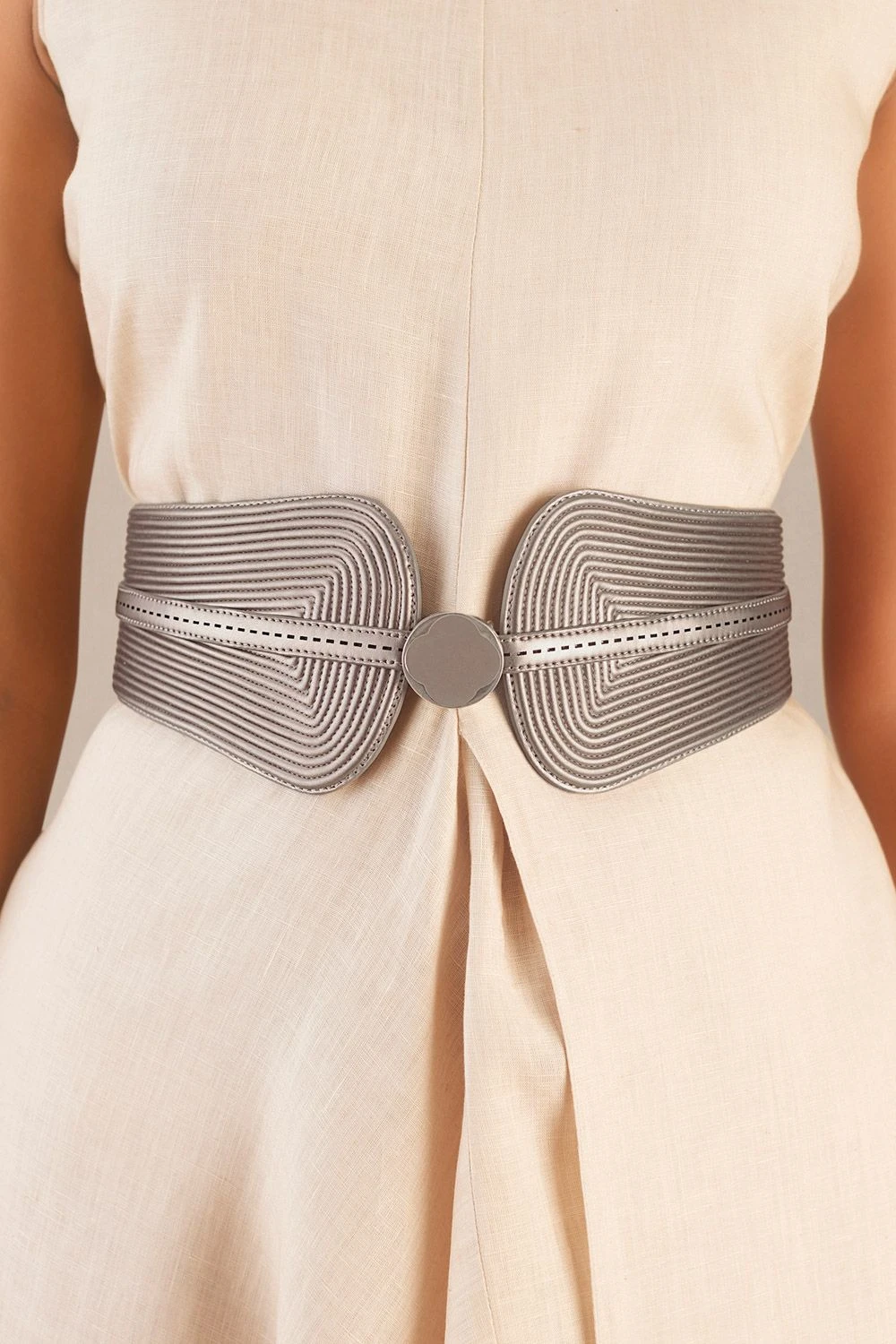 Embrace opulence with the Ariana belt in metallic toosh corded faux leather. The intricate perforations & delicate enamel buckle create a statement piece that effortlessly merges style & sophistication. Elevate your ensemble with this chic accessory.