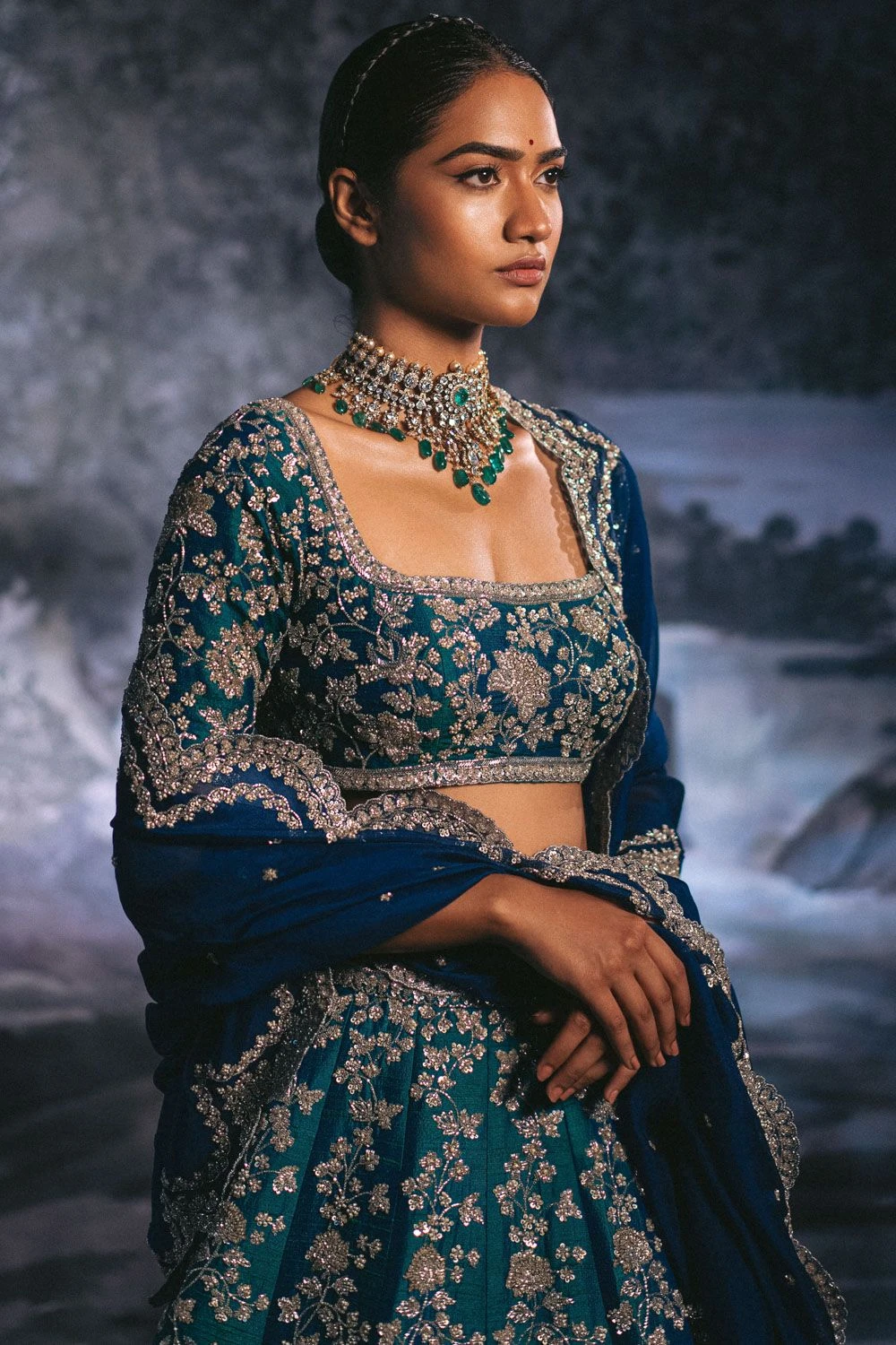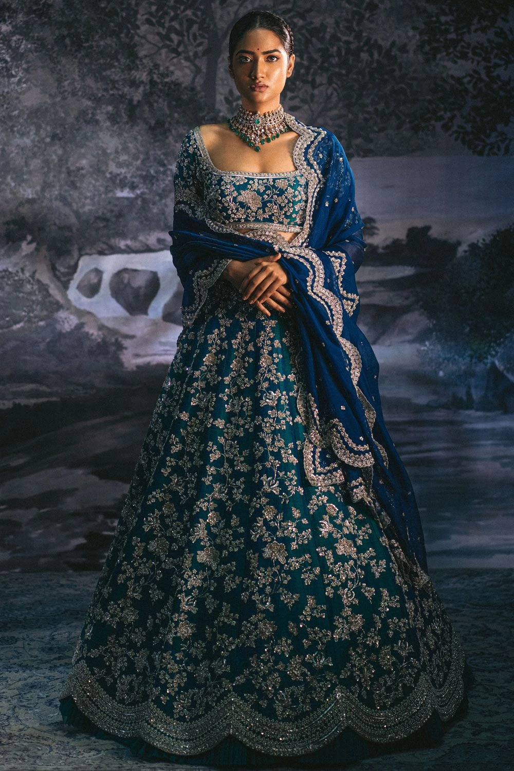 This emerald green lehenga set speaks of grandeur with every single detail. It is designed in a raw silk base and adorned with full creeper cutdana work with scalloped border. A perfect ensemble for a wedding reception.