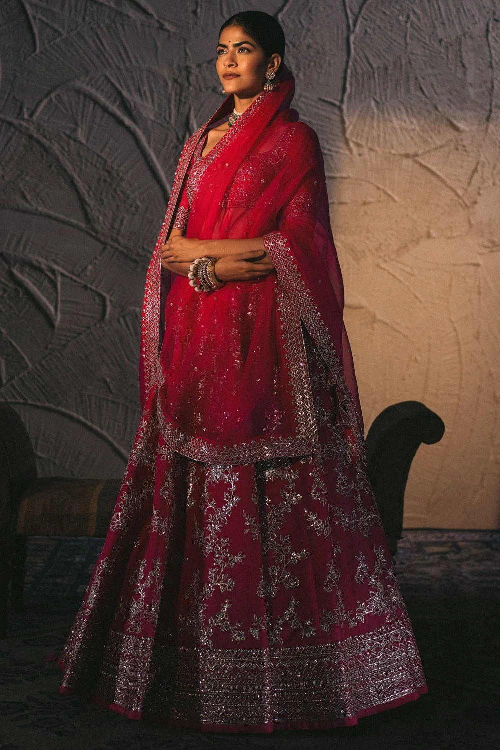 Anushree Reddy ensures you a magnificent look on your wedding day with this classic pink lehenga set in organza. It is adorned with sparkling sequin embroidery all over. You can adorn an elegant diamond necklace with this look.