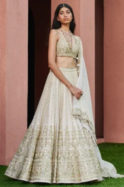 This beige & gold cutdana & mirror hand embroidered lehenga set is perfect for daytime wedding festivities. This summery piece is perfect for an engagement function.