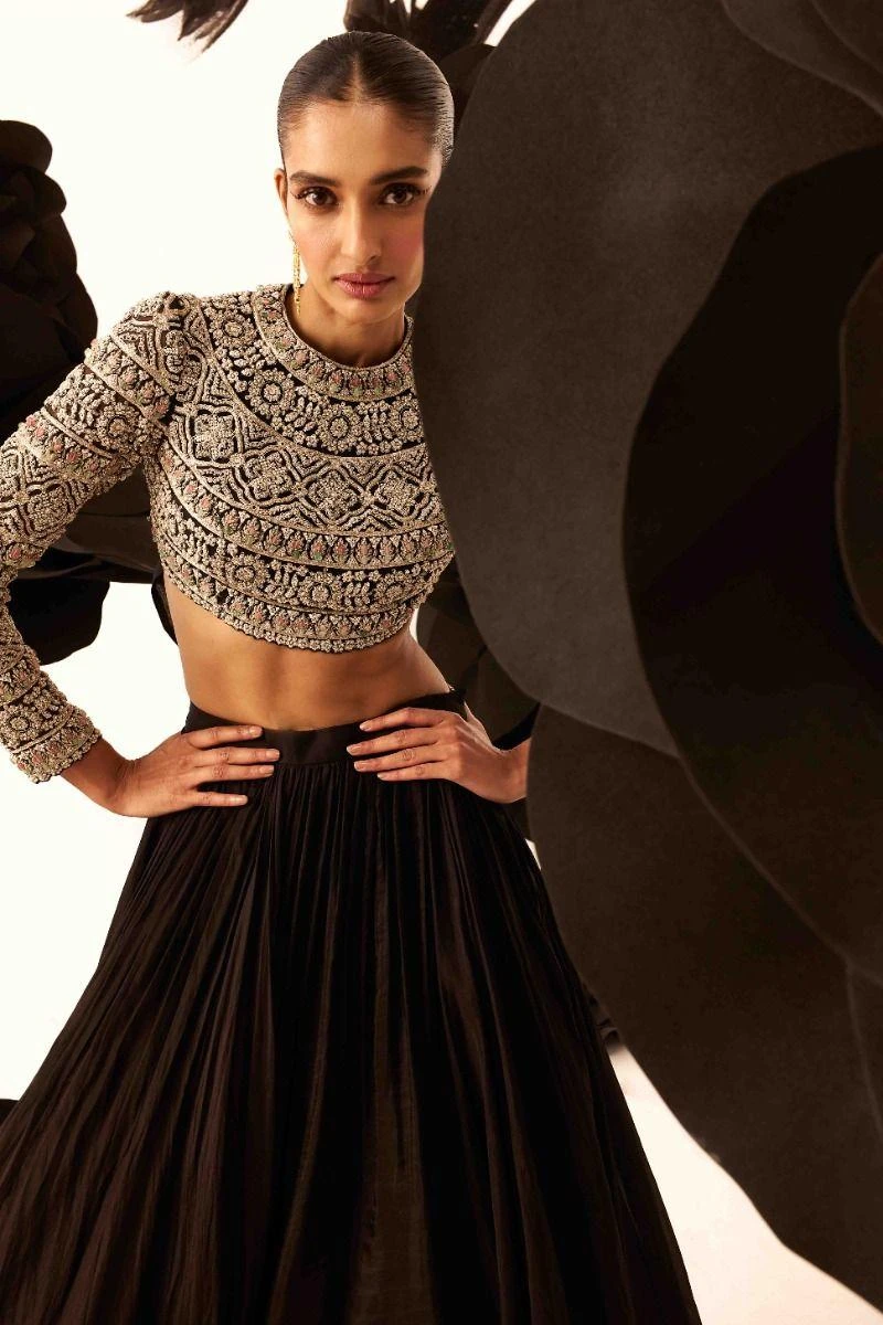 Elegance takes center stage with this black heavy floral embroidery blouse, accentuated by a charming back bow, paired gracefully with a flowing black organza skirt. A harmonious blend of artistry and style.