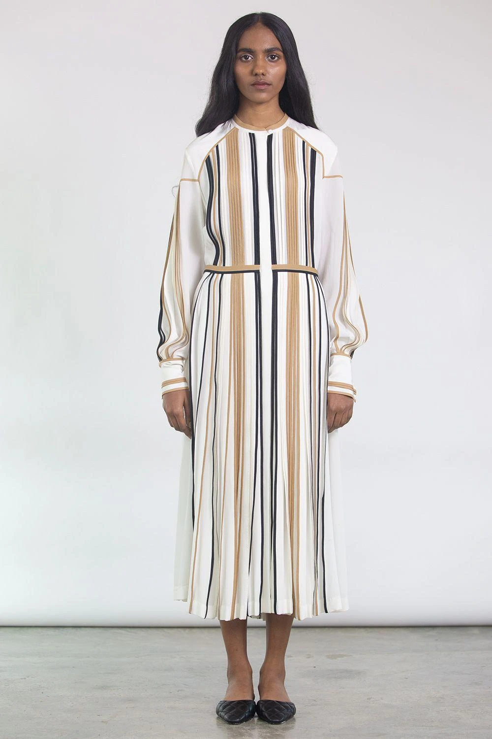 A basic fluid dress detailed with Bodice’s signature bound pleats. Wear this special piece for a special occasion paired with nude strap wedges and classic pearl earrings.