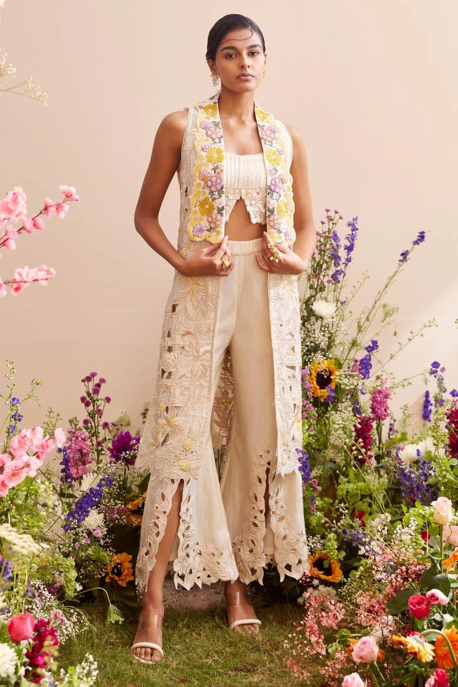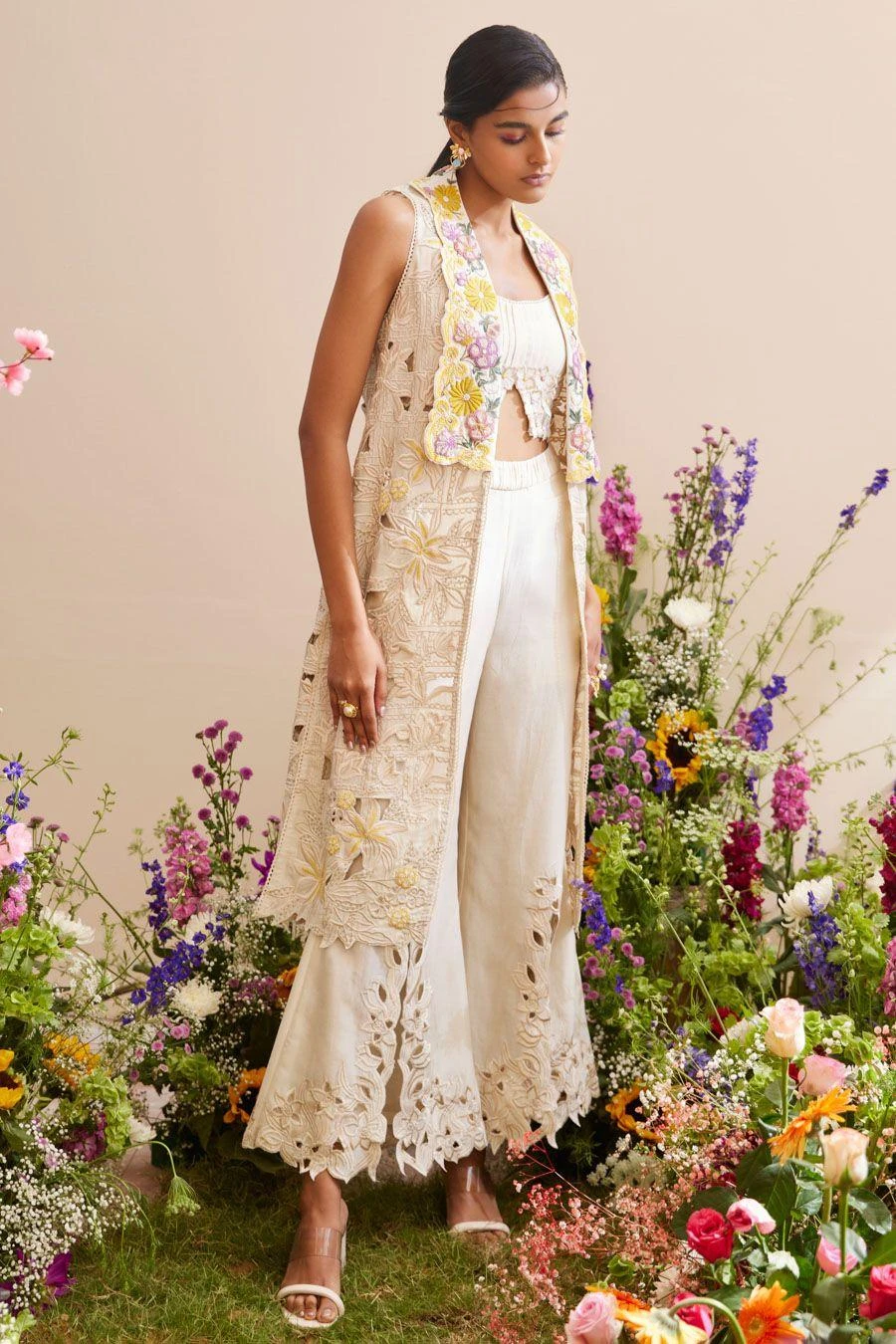 These ivory pants are perfect for daytime wedding festivities. Crafted in chanderi, these bell bottoms feature intricate cutwork details. Style this one of a kind piece with the Ivory floral pleated bustier for a chic & youthful look.