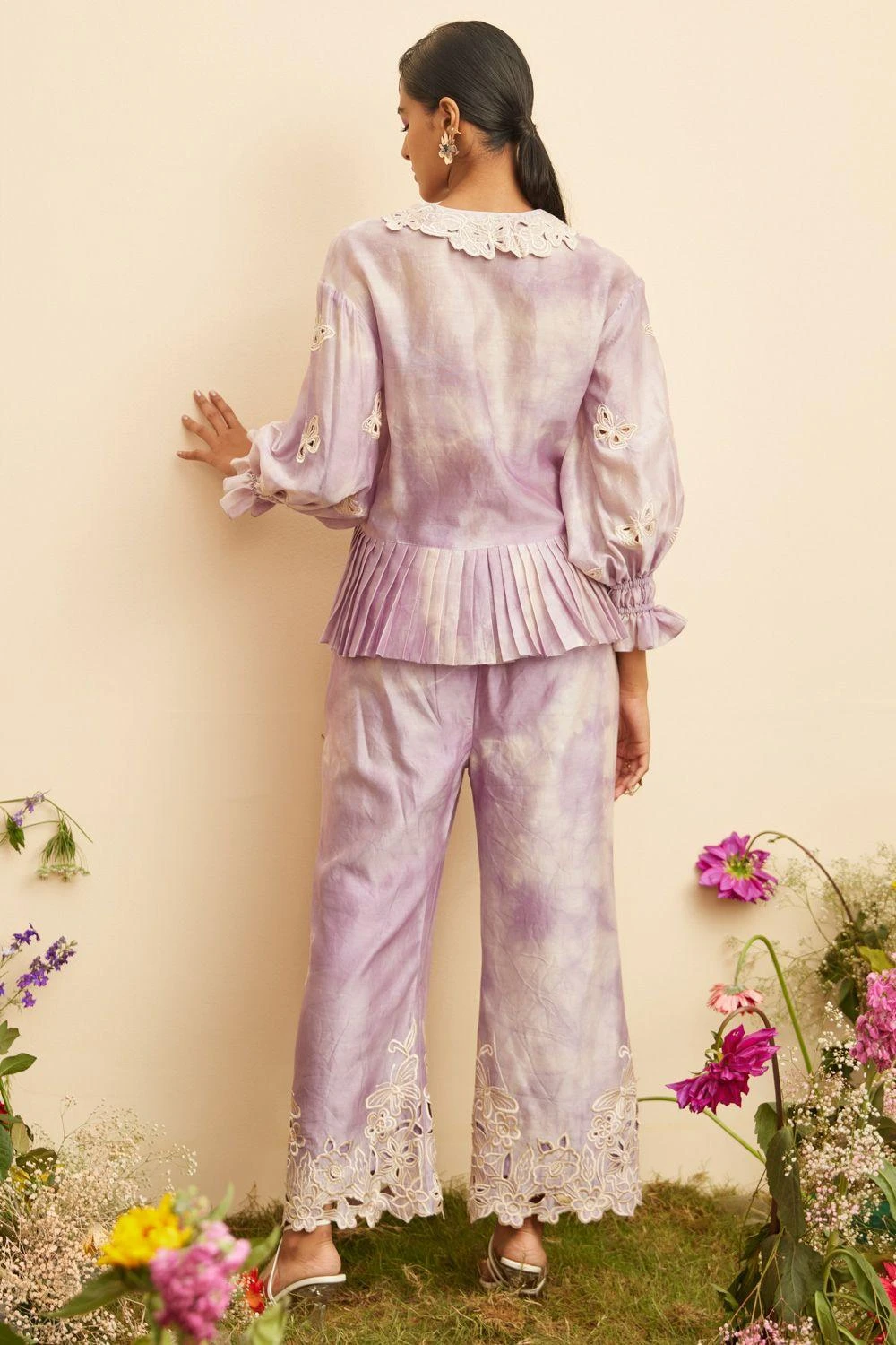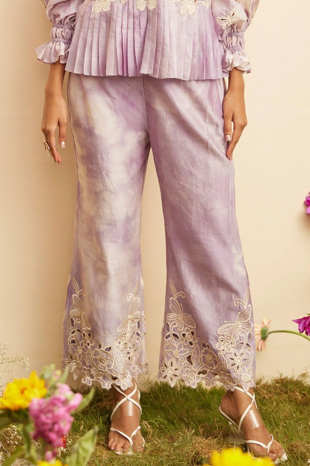 Embrace sophistication in these lilac chanderi tie-dye contrast threadwork pants. Intricate threadwork detailing on the tie-dye chanderi fabric adds a touch of artistry to these pants, elevating your ensemble to new levels of style.