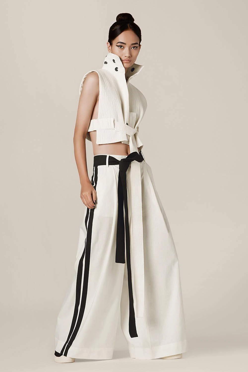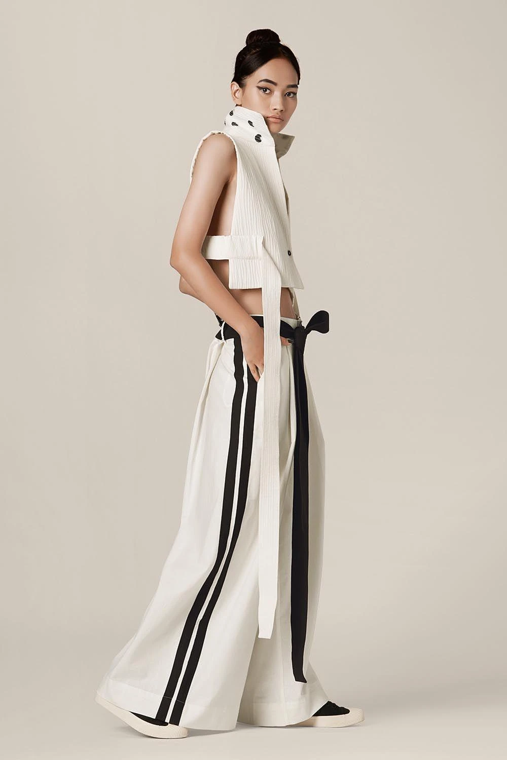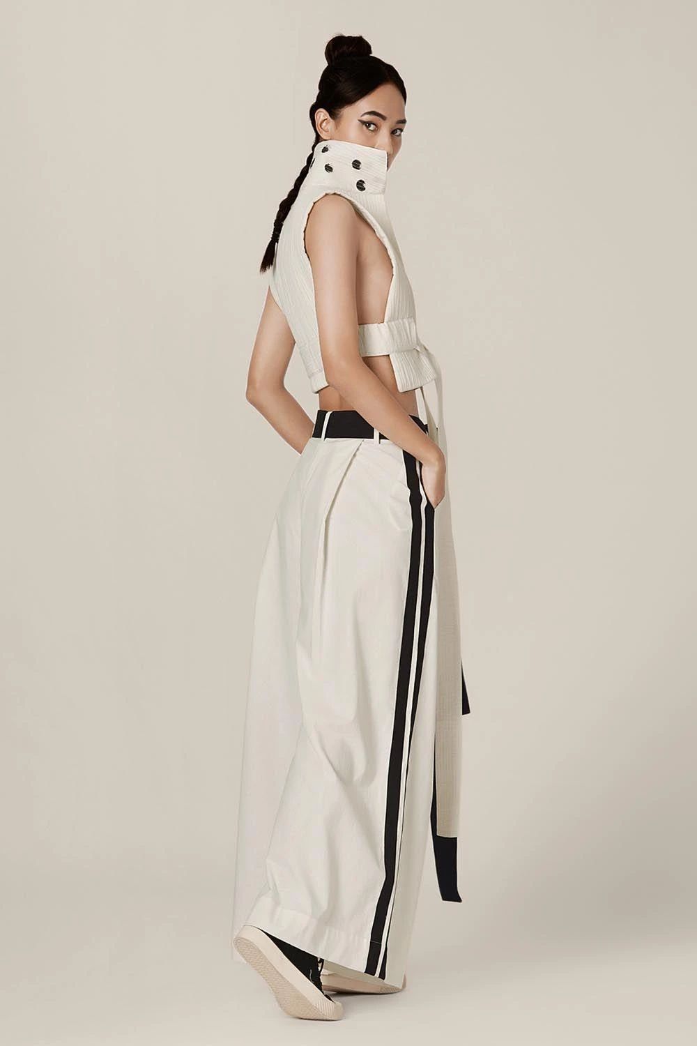 This pair of pleated trousers are both sporty & chic. These white flared pants aer graceful while the black side striped add a young element to the look!