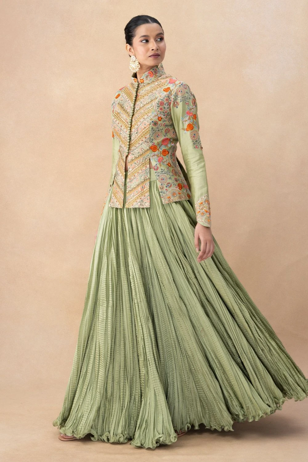 The perfect amalgamation of style & comfort, this lehenga set works across occasions. Crafted in chanderi, this set features a floral embellished boho jacket with a skirt. Add a pair of statement earrings to complete the look.