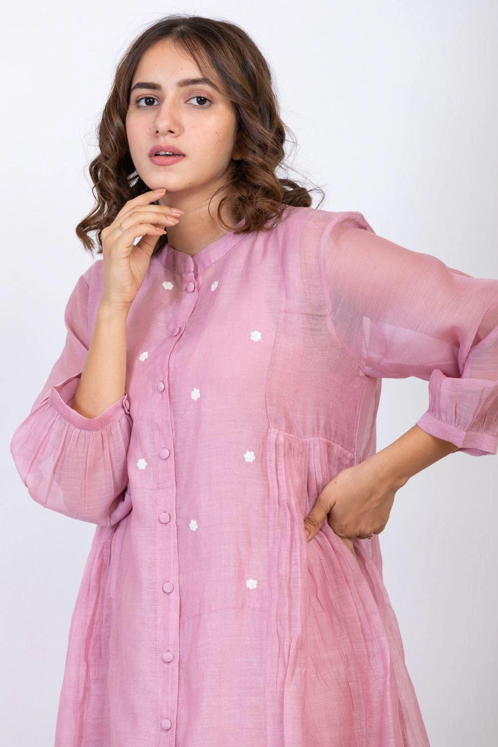 This lilac rose pleated dress is crafted in chanderi silk and adorned with impressionist florals and embroidery details. The front button opening allows you to wear it as an overlay with your summer slips.