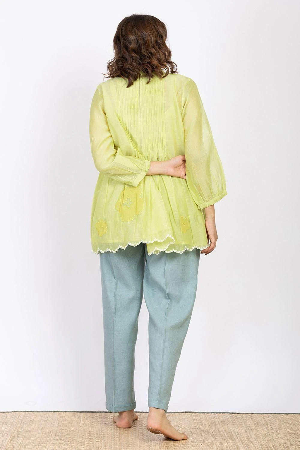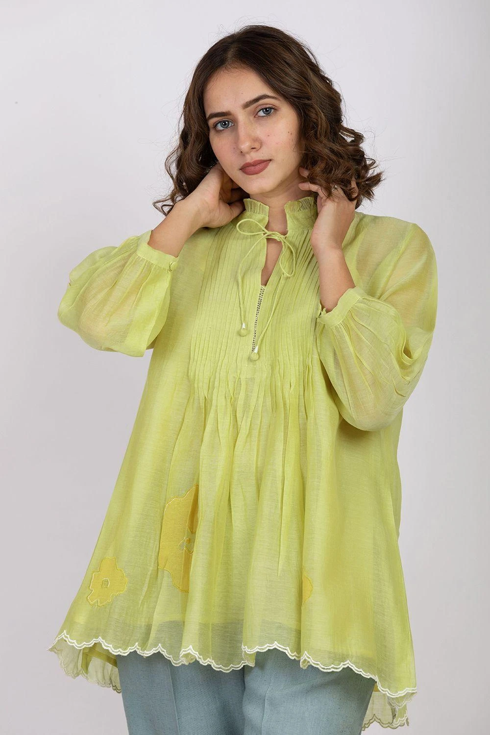 Crafted in handwoven chanderi silk, this tunic features minimalist floral hand printing highlighted with embroidery details, soft gathers & a scalloped hem. It comes with an inner slip. Style this top with blue trousers to complete the look.