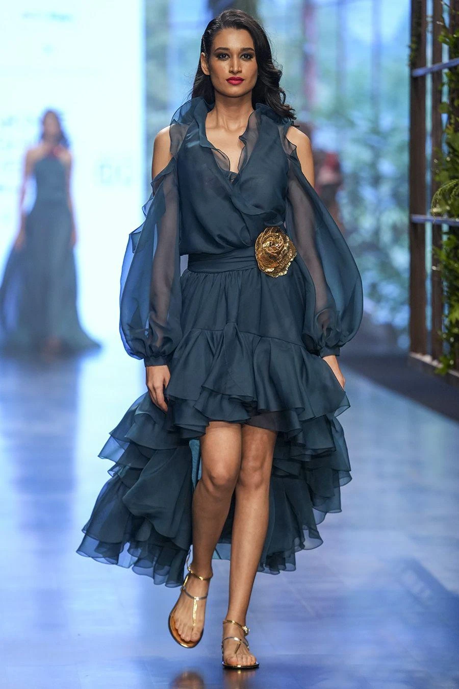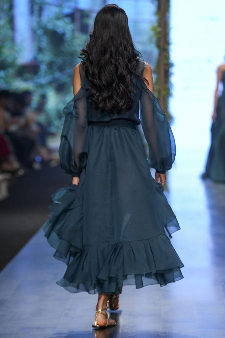 This bottle green dress hits all the style points for a perfect evening dress. This cold shoulder dress with an overlapping neck features a ruffle detail. Style it with a pair of statement earrings & heels to complete the look.