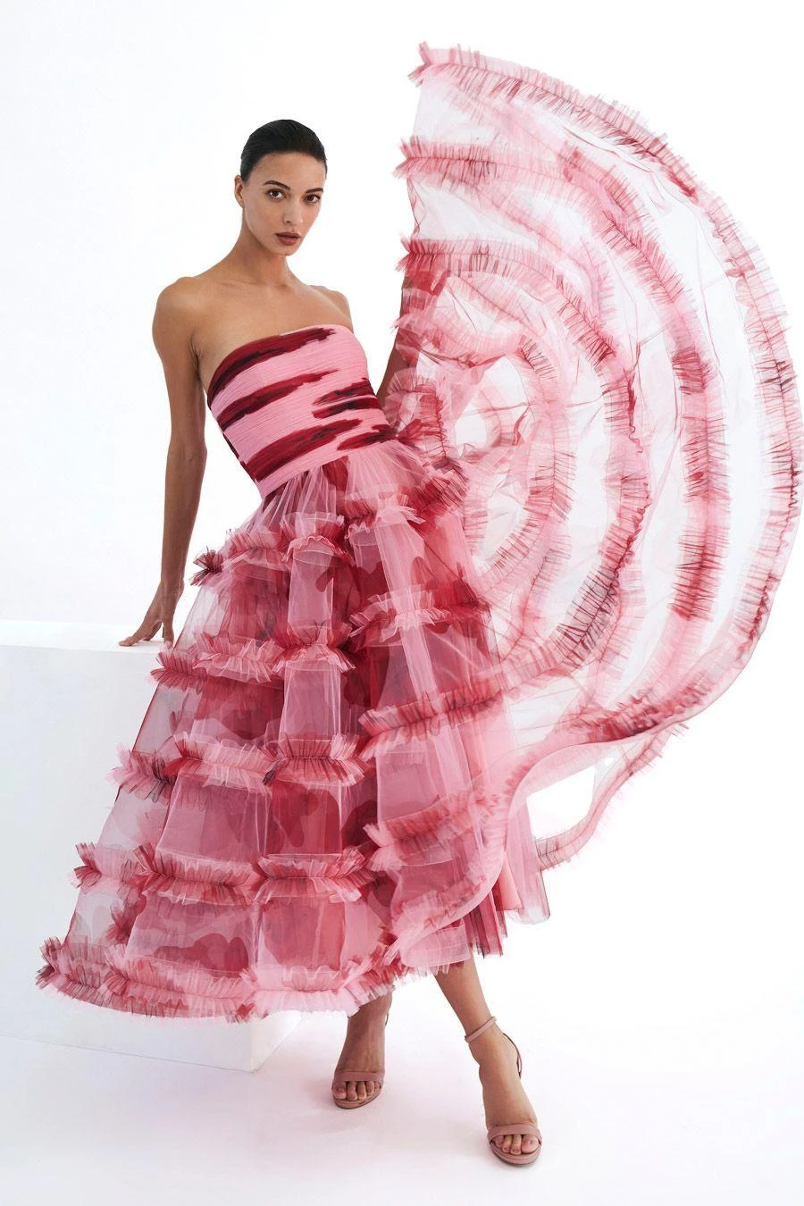 Indulge in the timeless elegance of this dress, adorned with ruffles & embellished with floating peony motifs. The perfect combination of femininity & sophistication, this dress is sure to make you the centre of attention at any occasion.