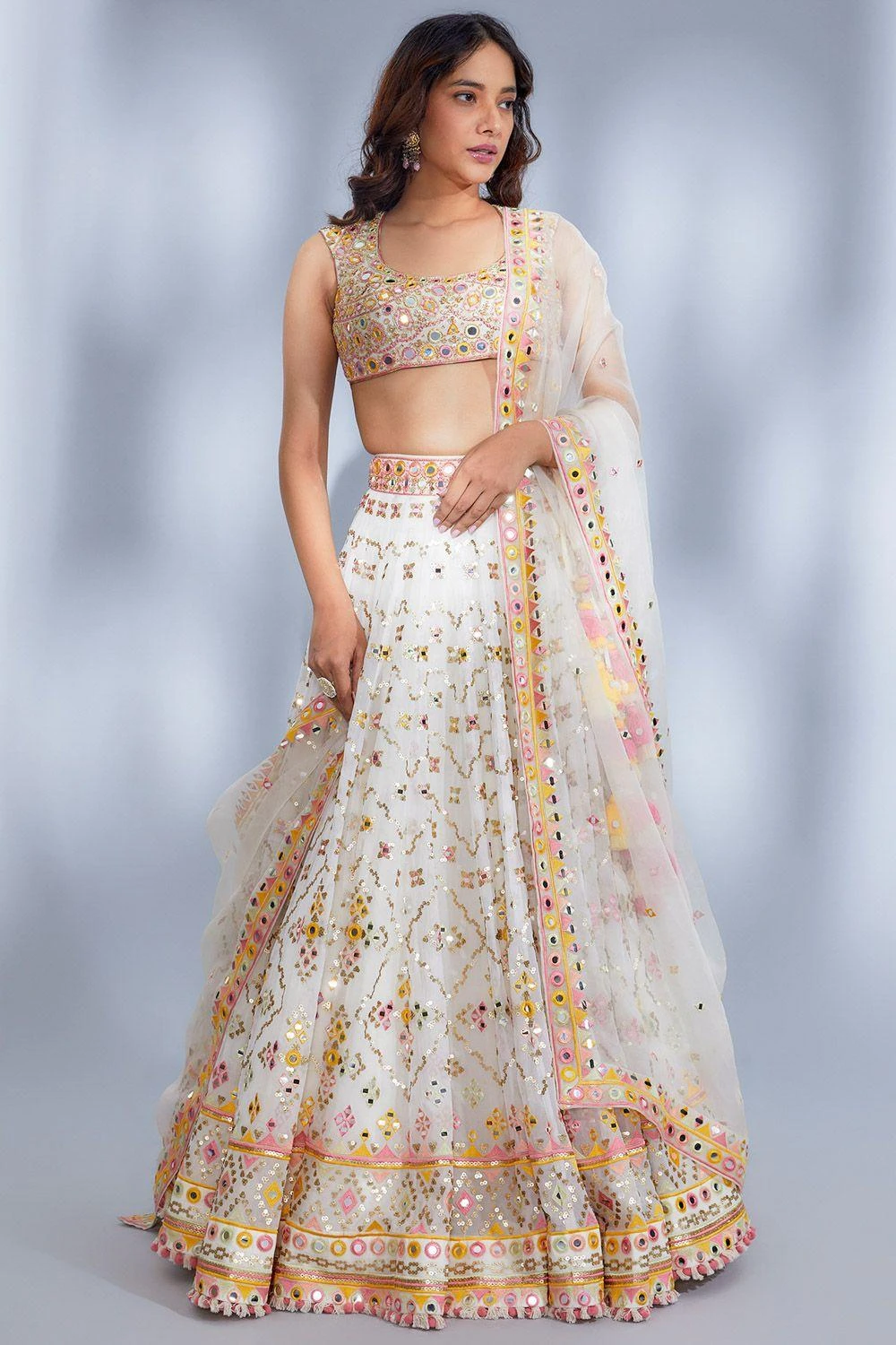 Look effortlessly stylish with this lehenga set. The flattering bustier features intricate embroidery, resham, and mirror work, while the organza panel lehenga adds grace. Complete the ensemble with the ethereal organza dupatta.
