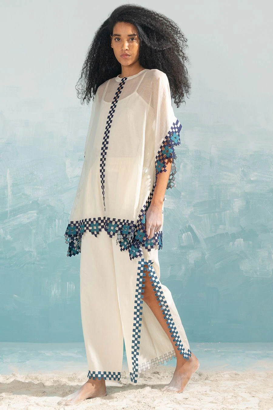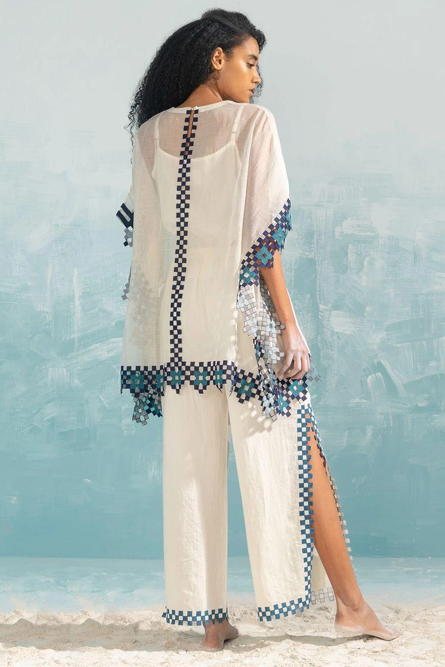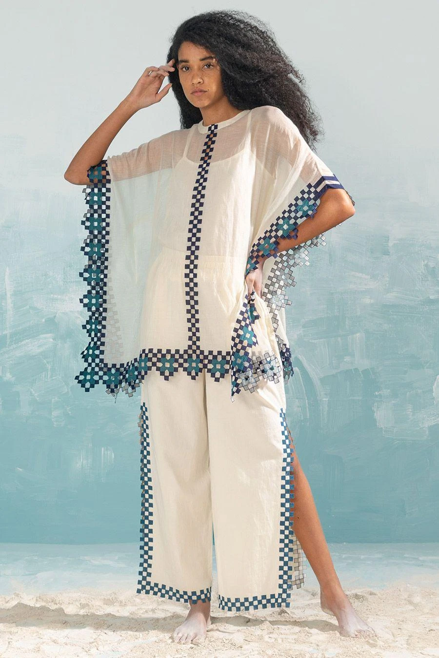 These ivory high slit pants fall in the realm of luxe minimalism. Crafted in cotton satin, these pants feature hand cut applique & cutwork details. Style them with the Ivory cape cutwork top from the collection to complete the set.