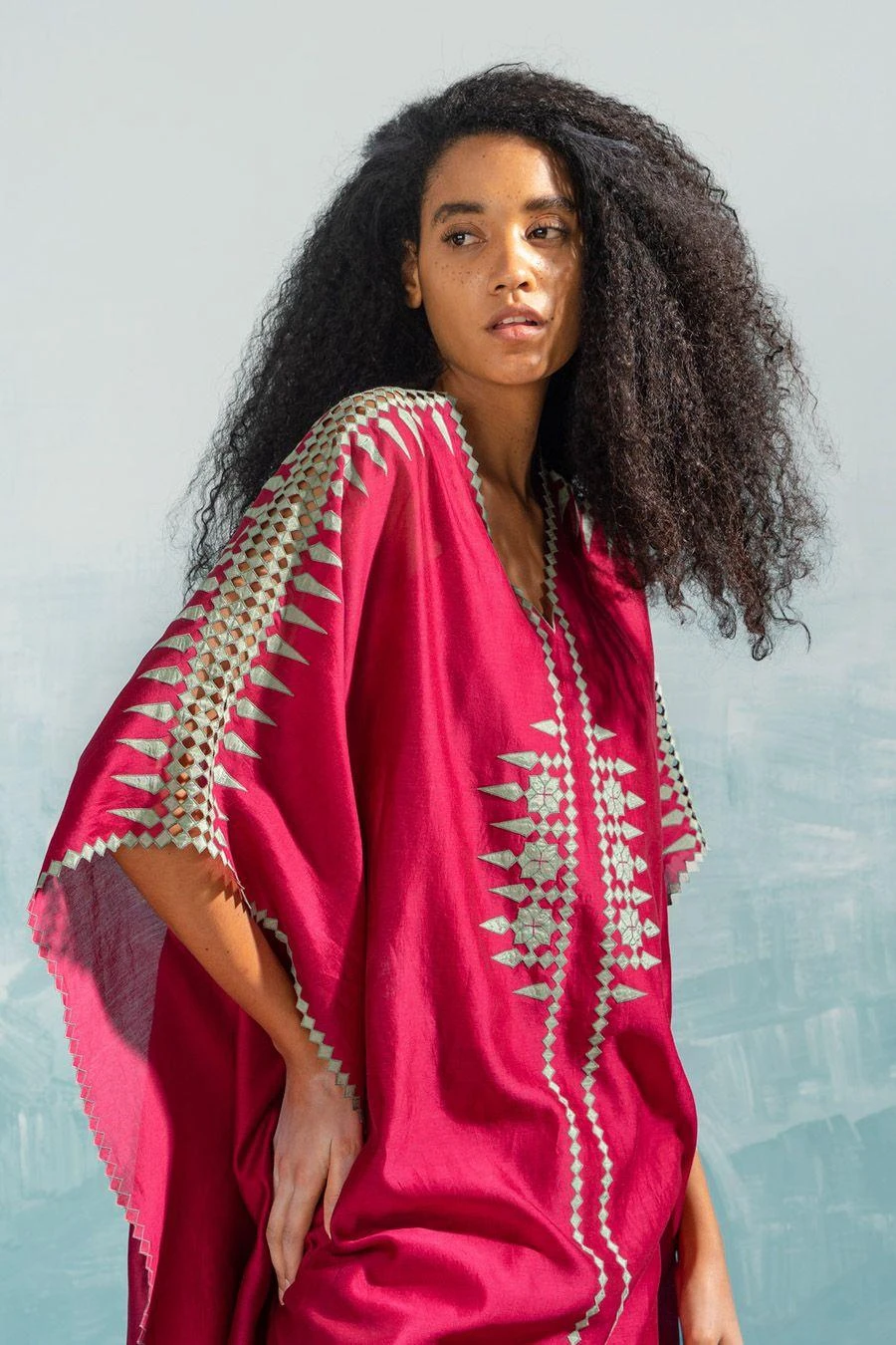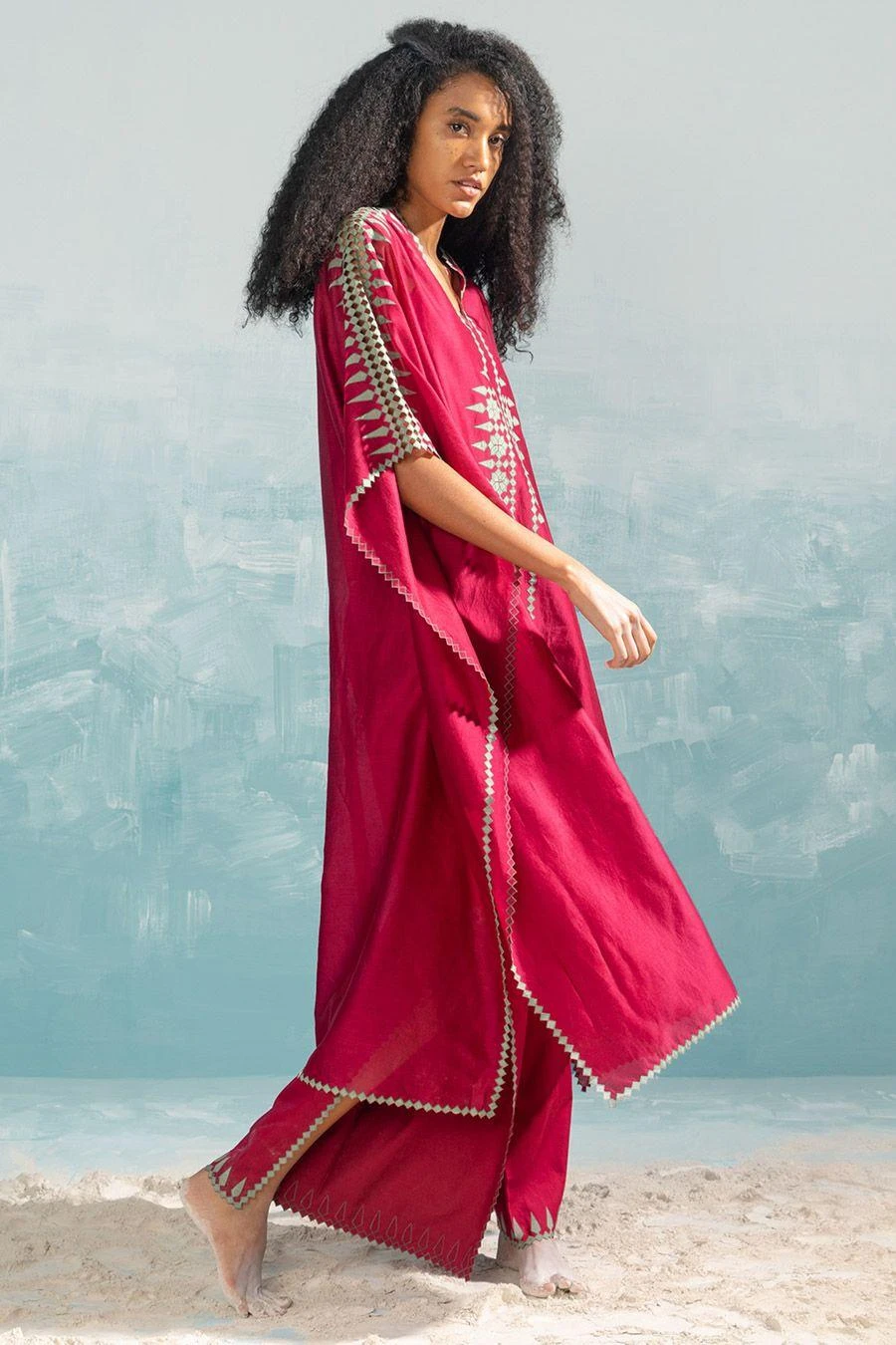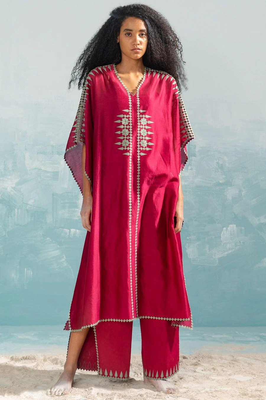 These pink high slit cutwork pants fall in the realm of luxe minimalism. Crafted in cotton satin, these pants feature hand cut applique & cutwork details. Style them with the Persian pink cutwork kaftan from the collection to complete the set.