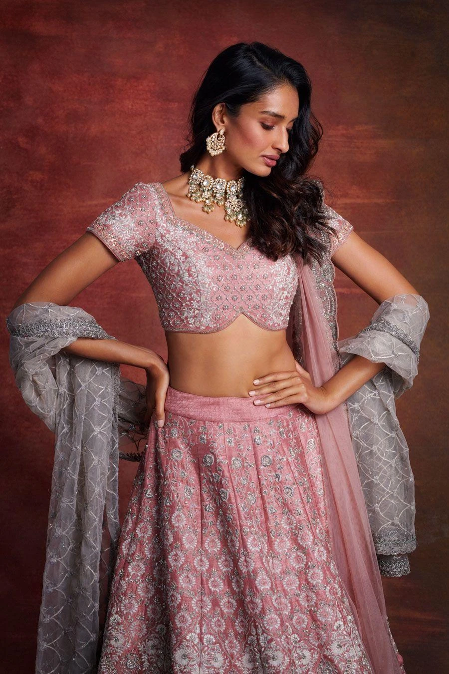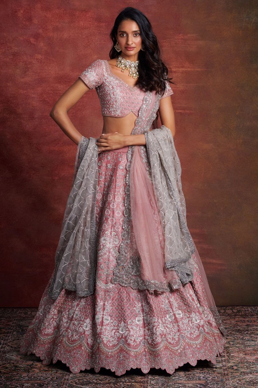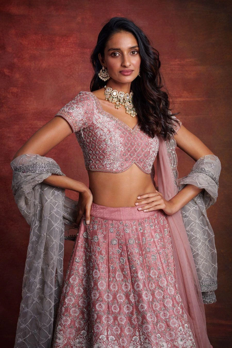 Make a breakthrough bride in this magnificent pink lehenga set. It is crafted in raw silk which brings opulence to this outfit & the painstaking zardosi embroidery graces it like nothing else. The ensemble comes along with pink & grey dupattas.