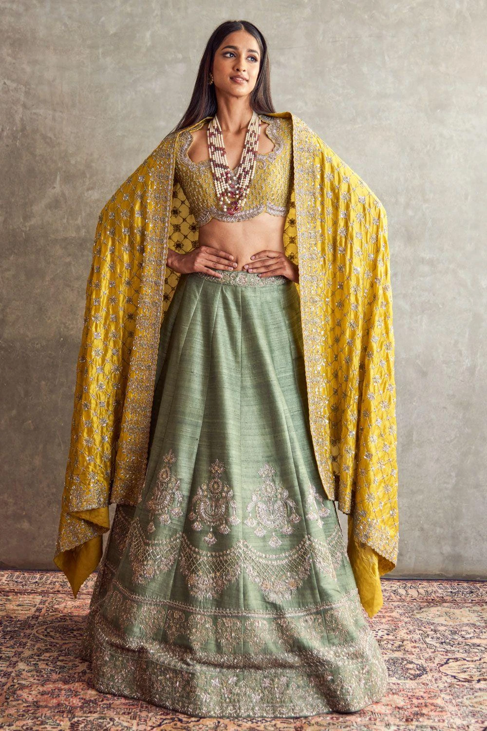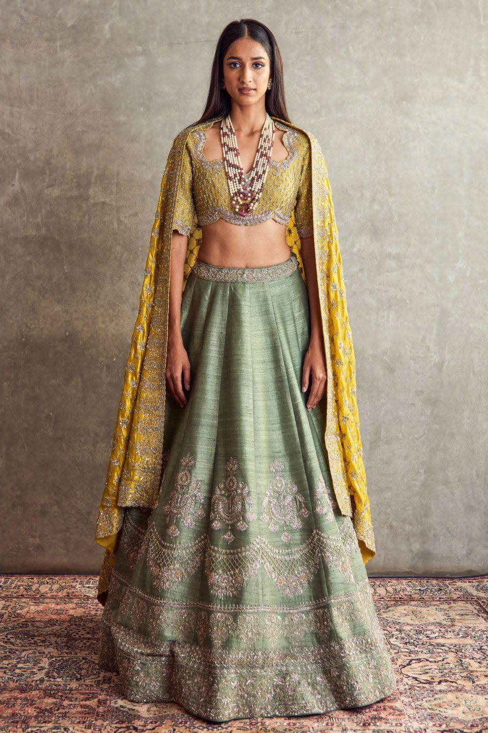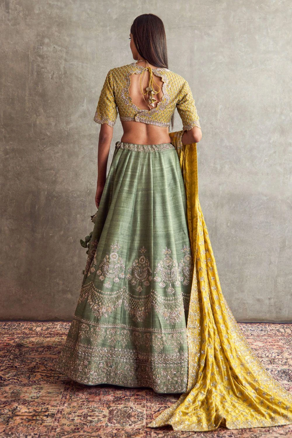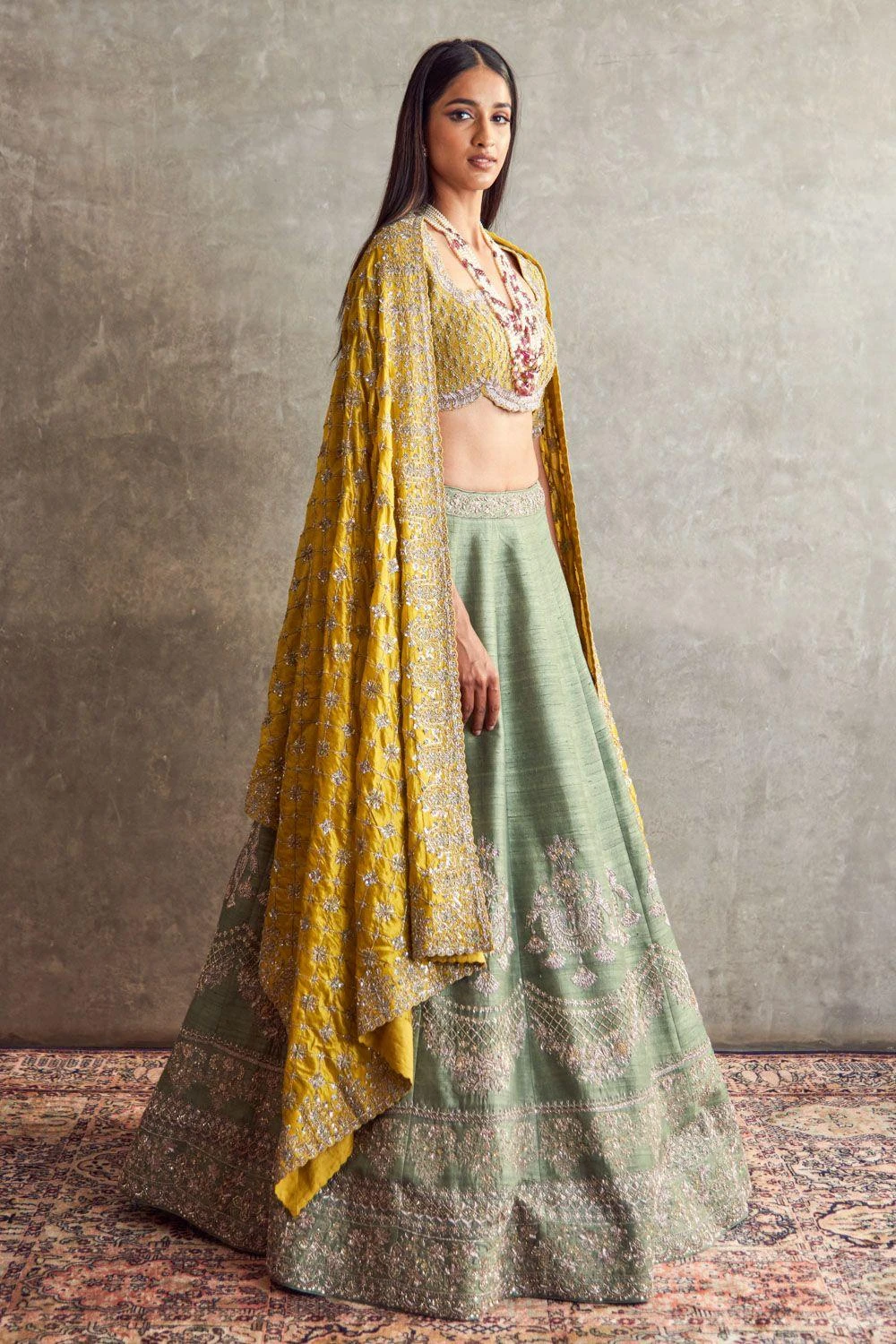 Experience opulence in this Mint Green Embroidered Lehenga elegantly coupled with a mustard yellow embroidered blouse and matching dupatta. A harmonious fusion of colors and intricate detailing, this ensemble captures the essence of timeless grace.