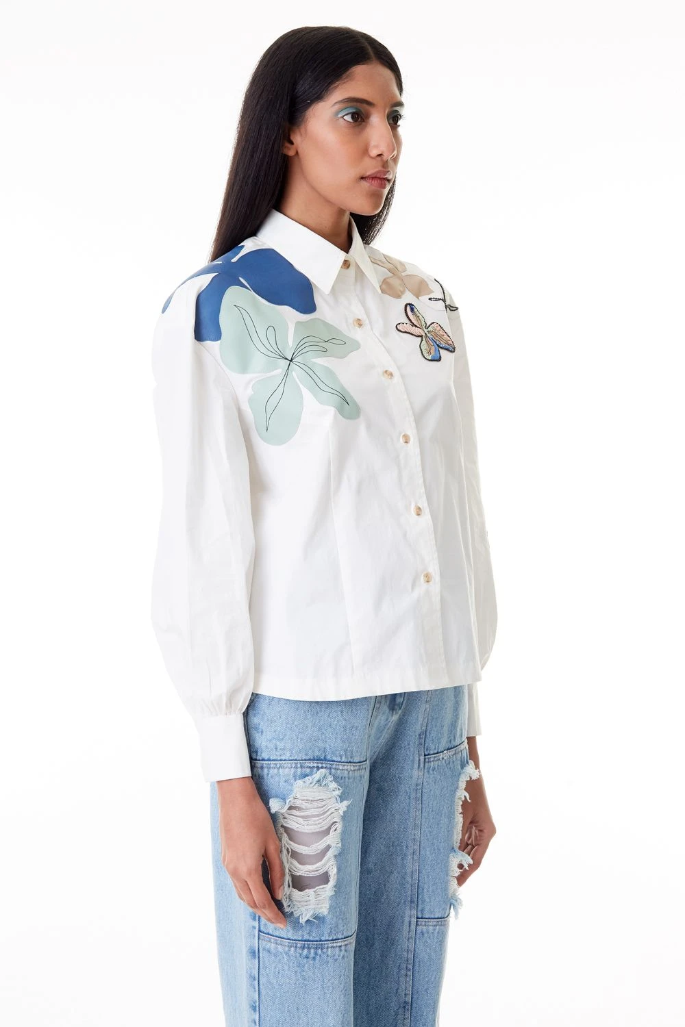 This reinvented classic white shirt is super versatile & chic. It is cut in crisp cotton and highlighted with floral cluster applique details, adding a quick pop of colour. Style it with a pair of blue denims and white sneakers.