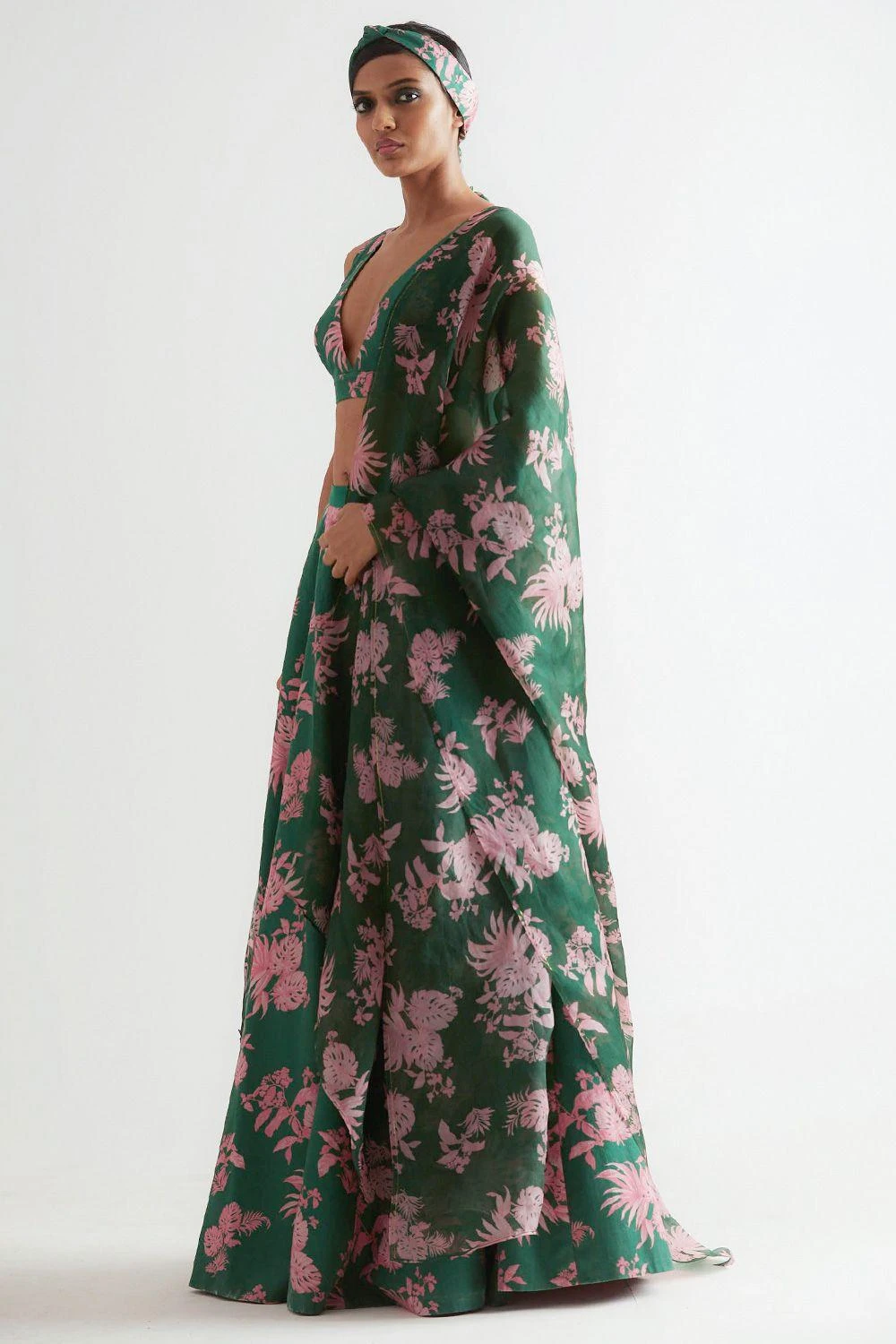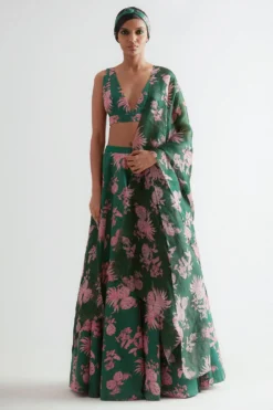 Look like a lush green garden blooming with the beauty of it’s flowers in this sigiriya green blouse and lehenga. Ideal for destination weddings and for bridesmaids looking for a fun yet luxurious piece to wear at their friend’s sangeet or mehendi.