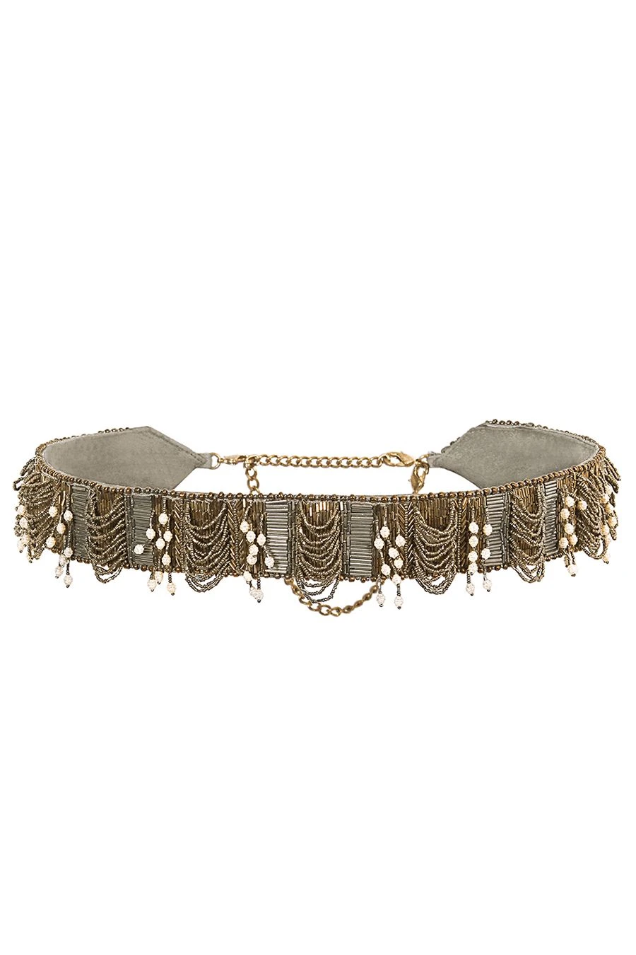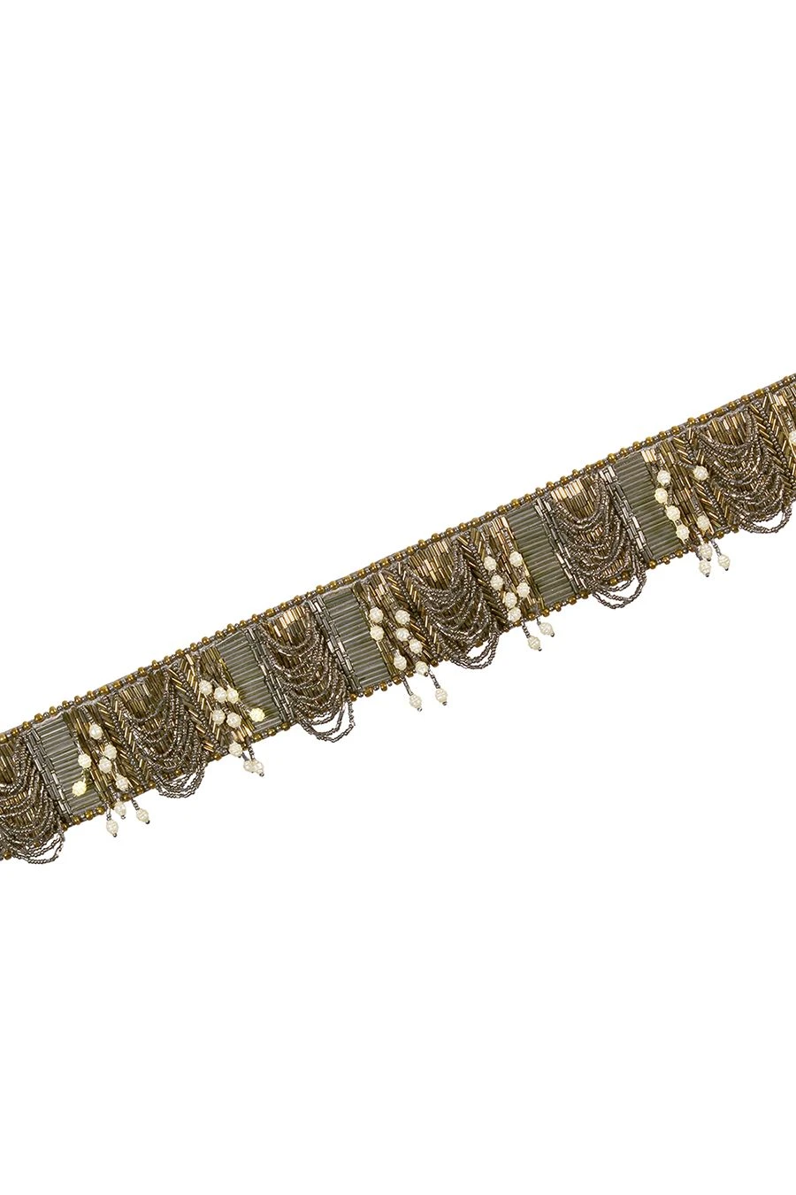 The ruche waist belt black is hand embroidered in a pave application with luminous silver and nocturnal black Japanese micro beads and baroque pearls. The surface of this belt is embellished with ornamental scallop tassels & baroque fringes.