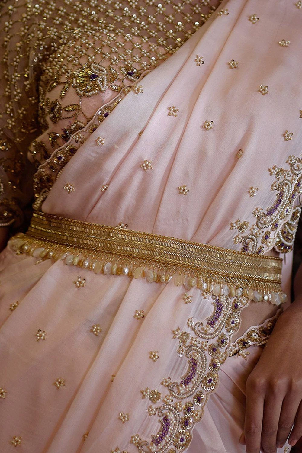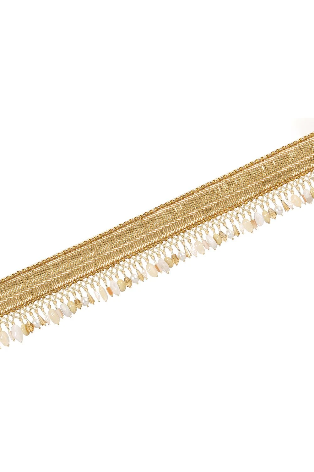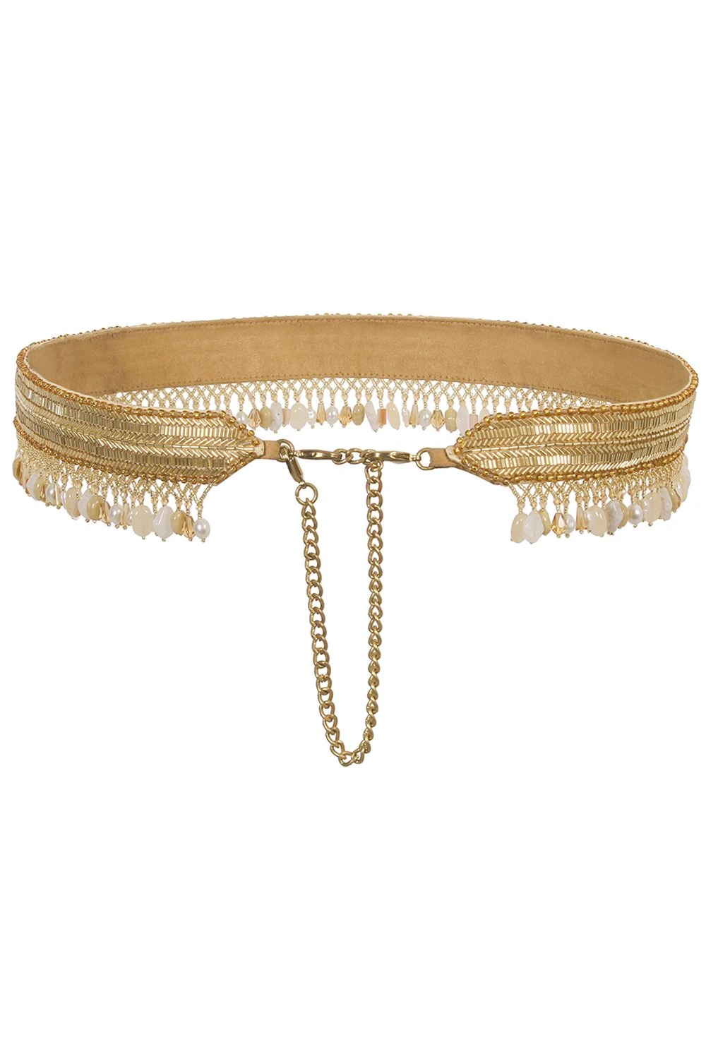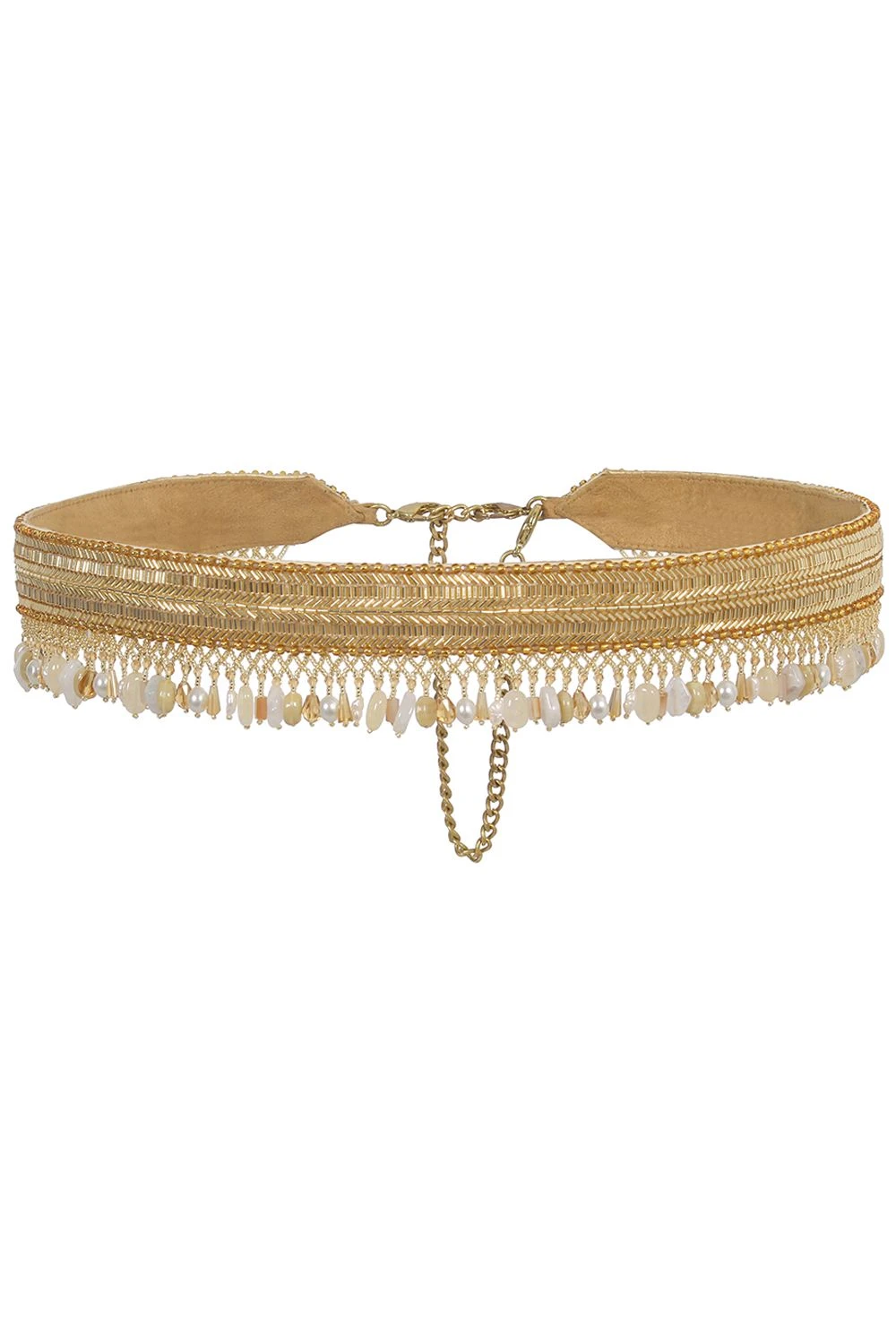 The noori waist belt is hand embellished with muted gold Japanese beads, luminous tubes, semi precious stones, iridescent crystals & pearls. The tassels make it a statement accessory versatile enough to enhance any look.