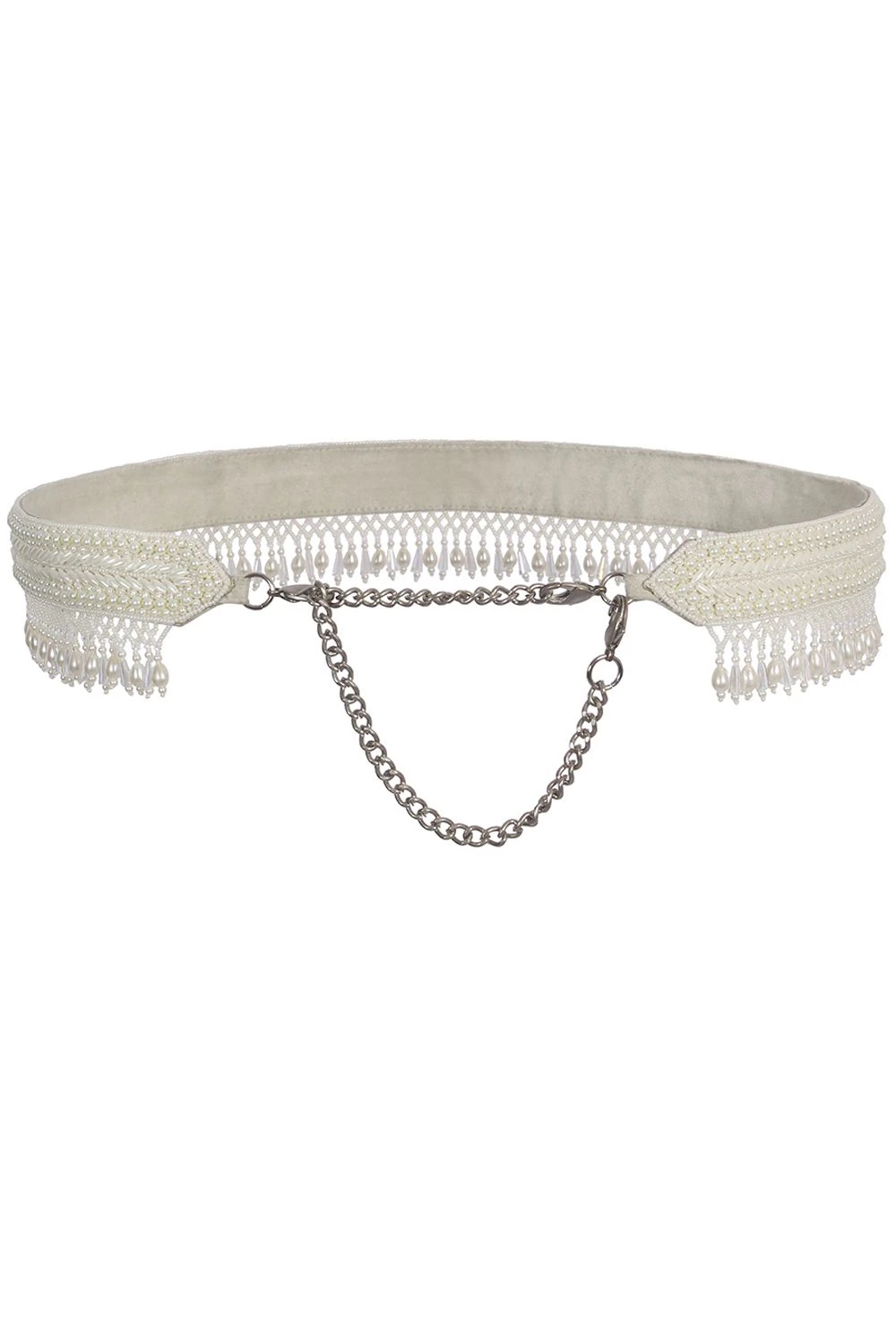 The noori waist belt is hand embellished with ivory pearls, Japanese beads, semi precious stones, iridescent crystals and pearls. The tassels of Japanese beads, crystals, semi precious stones and pearls give it a statement look.