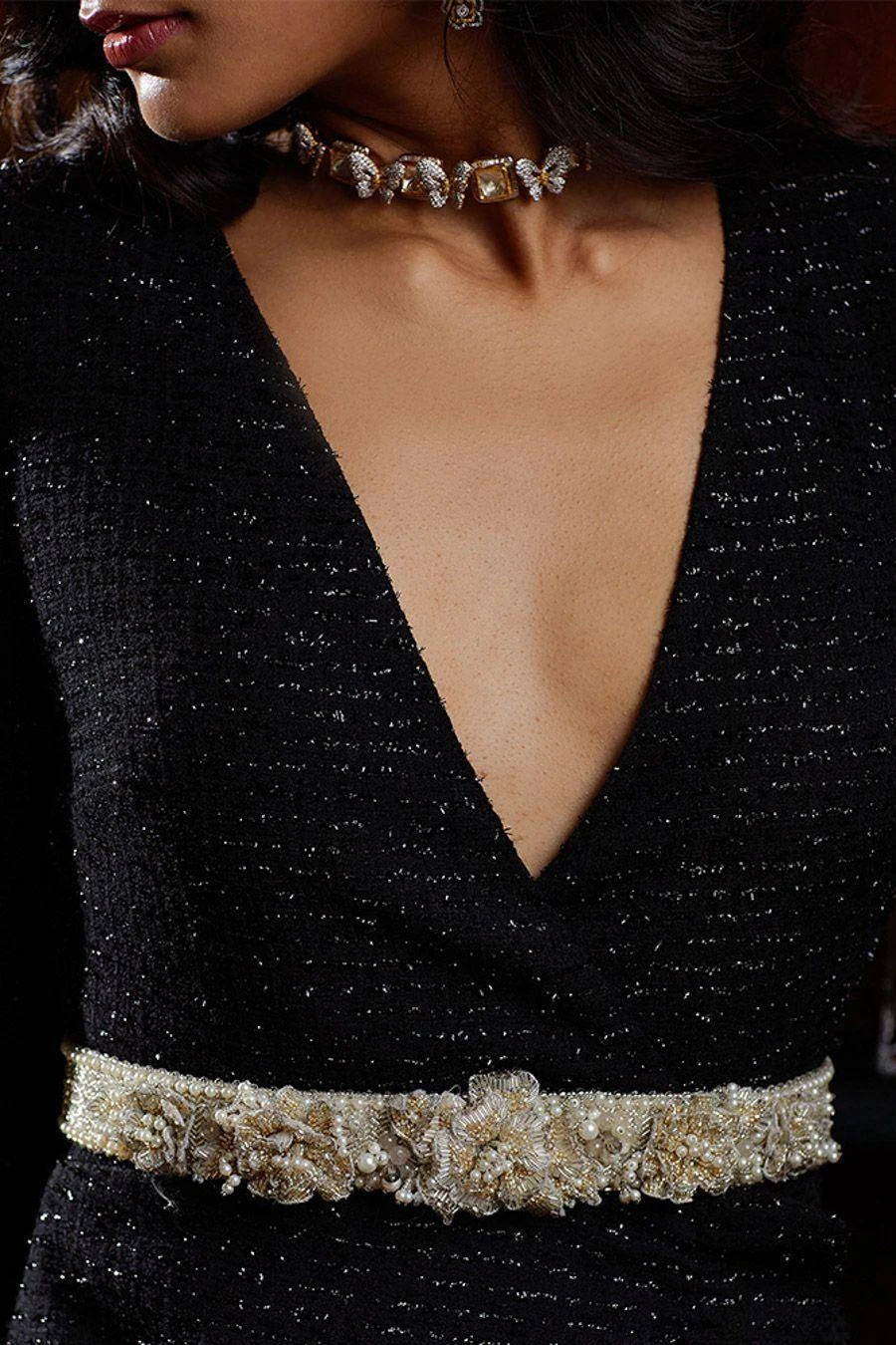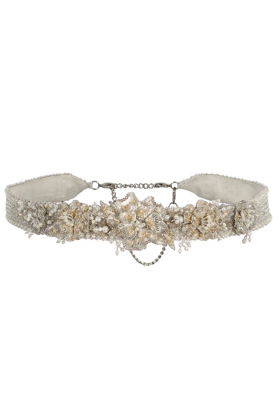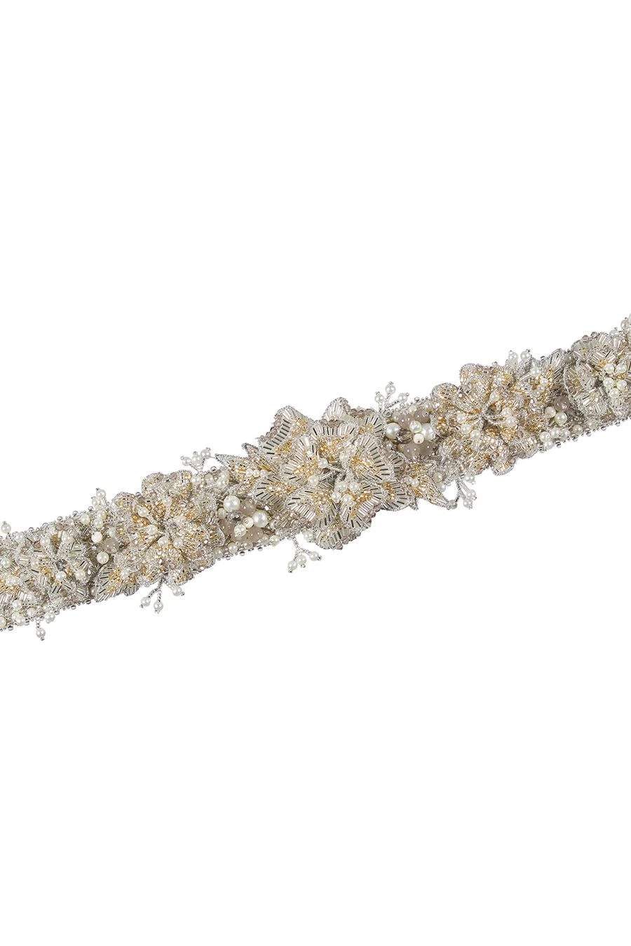 Inspired by a whimsical tropical garden, delicate beaded flowers adorn the esme waist belt silver on a textured bed of silver glistening bugle bead. It is embellished with silver Japanese beads, rhinestones, stones, crystals and pearls.