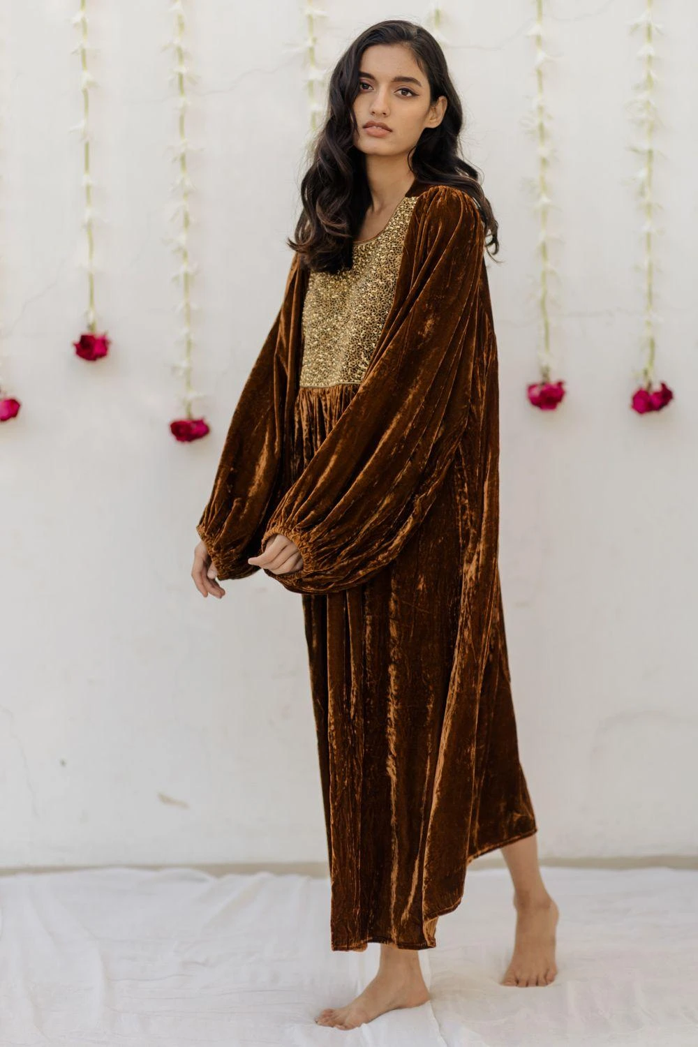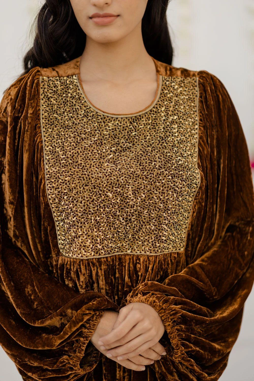 Elegance comes in ease with this mustard kaftan dress. It is crafted in royal velvet fabric and uplifted with scintillating gold hand embroidery detail on the yoke. You can style it with a pair of statement studs for an intimate occasion.