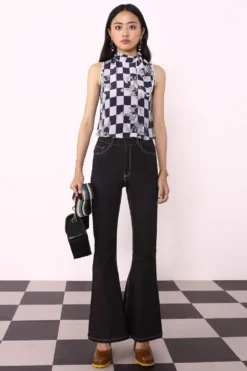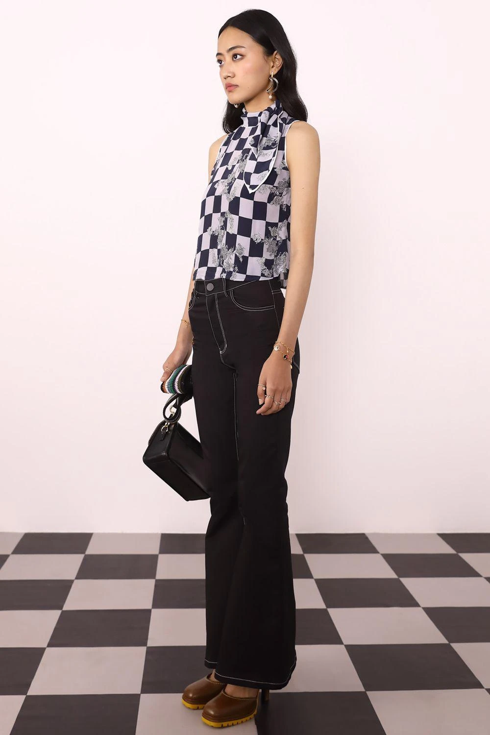 From work-appropriate to off-duty chic, this checkered top is a must-have for your wardrobe. This sleeveless top features a floral print, high stand collar and neck tie detailing. Pair this top with some denim pants and hoops.