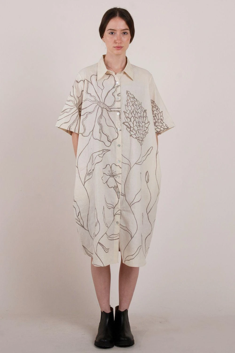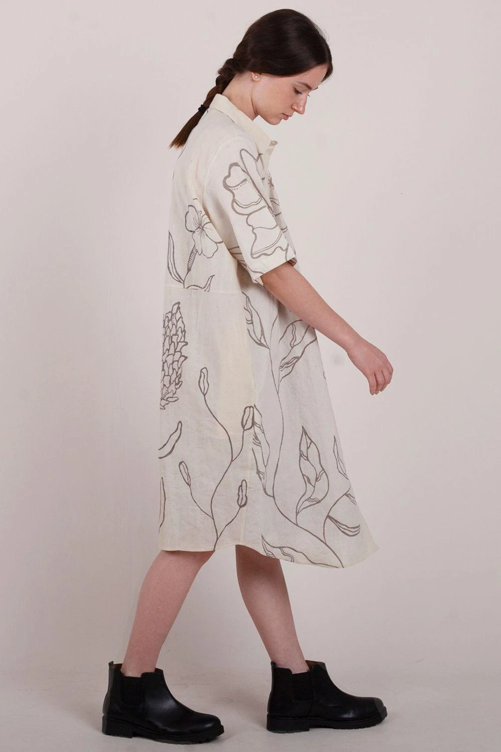 Indulge in the seamless transition from home to work with this elegant shirt dress. The circle-cut back adds a touch of intrigue and style. With the addition of side pockets, it combines practicality and sophistication.