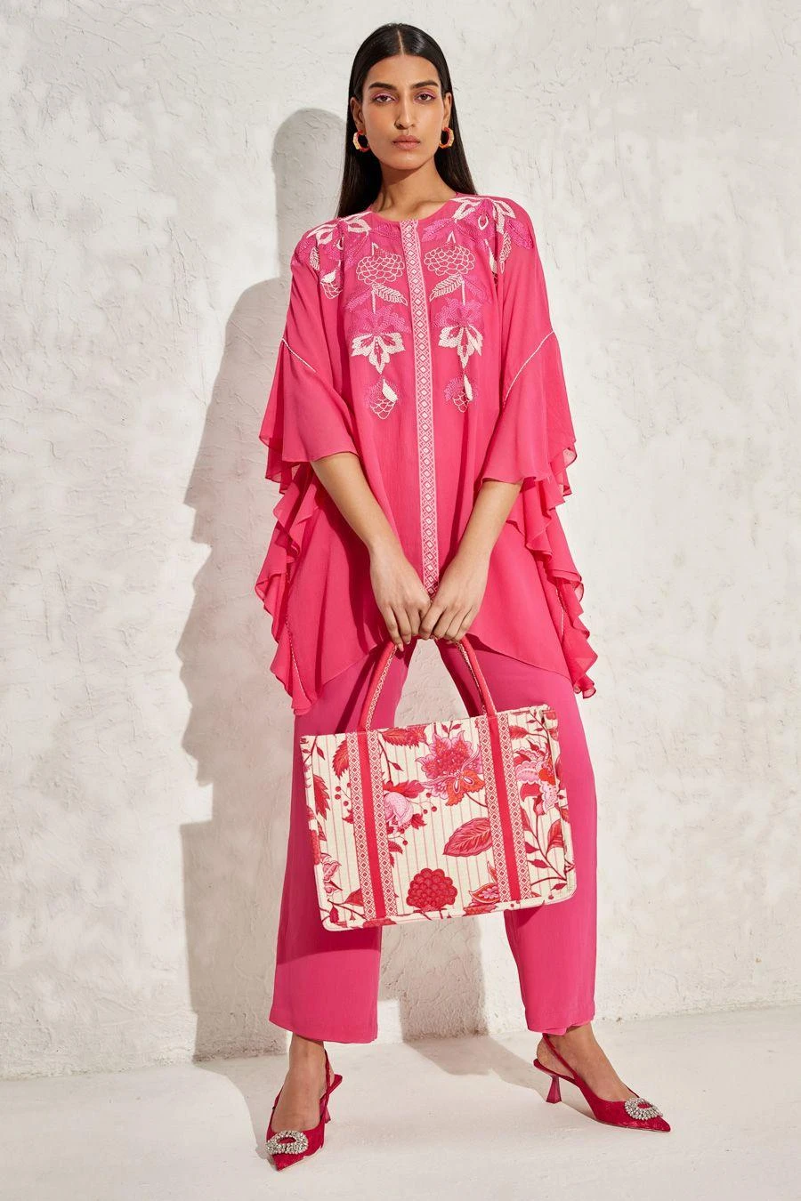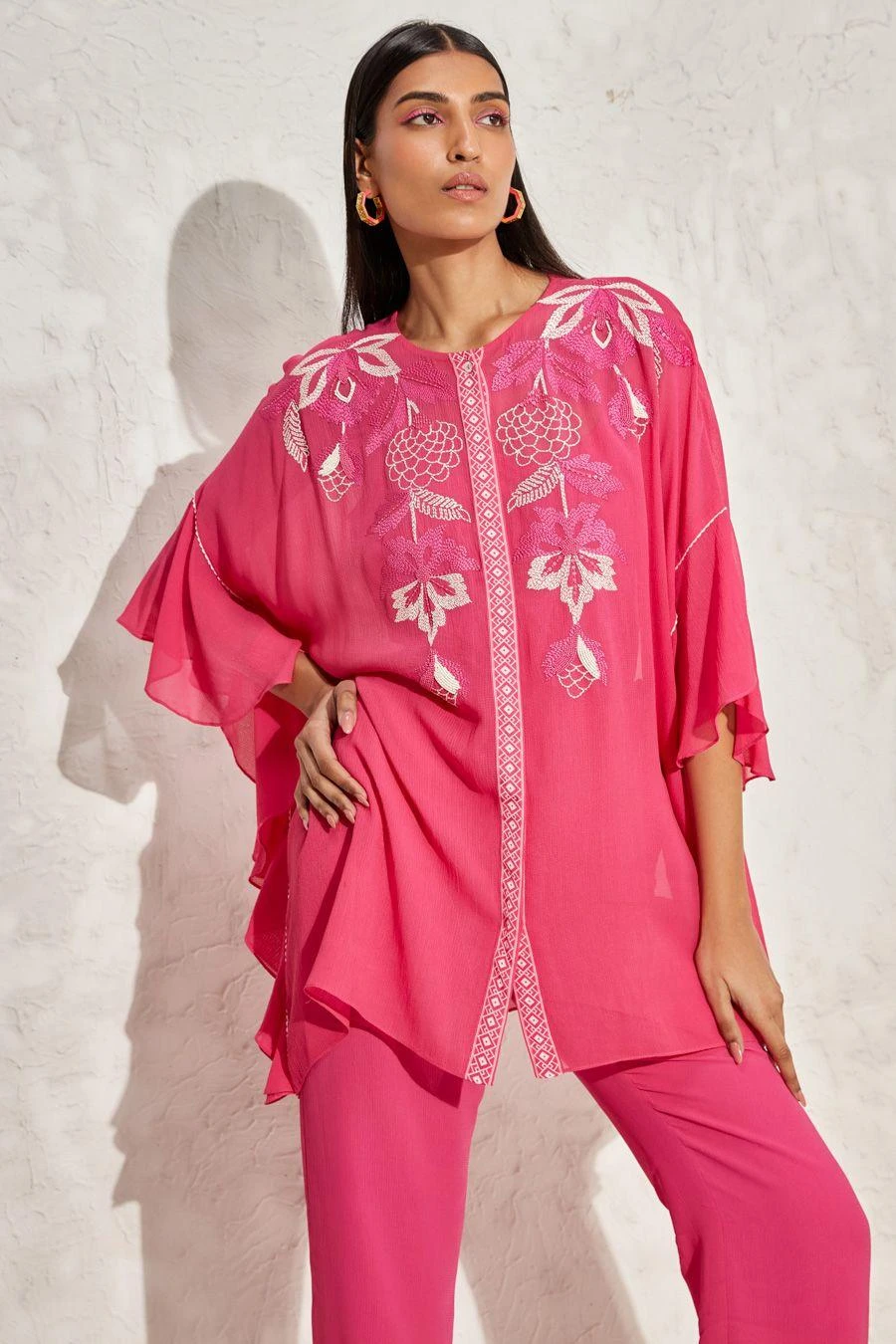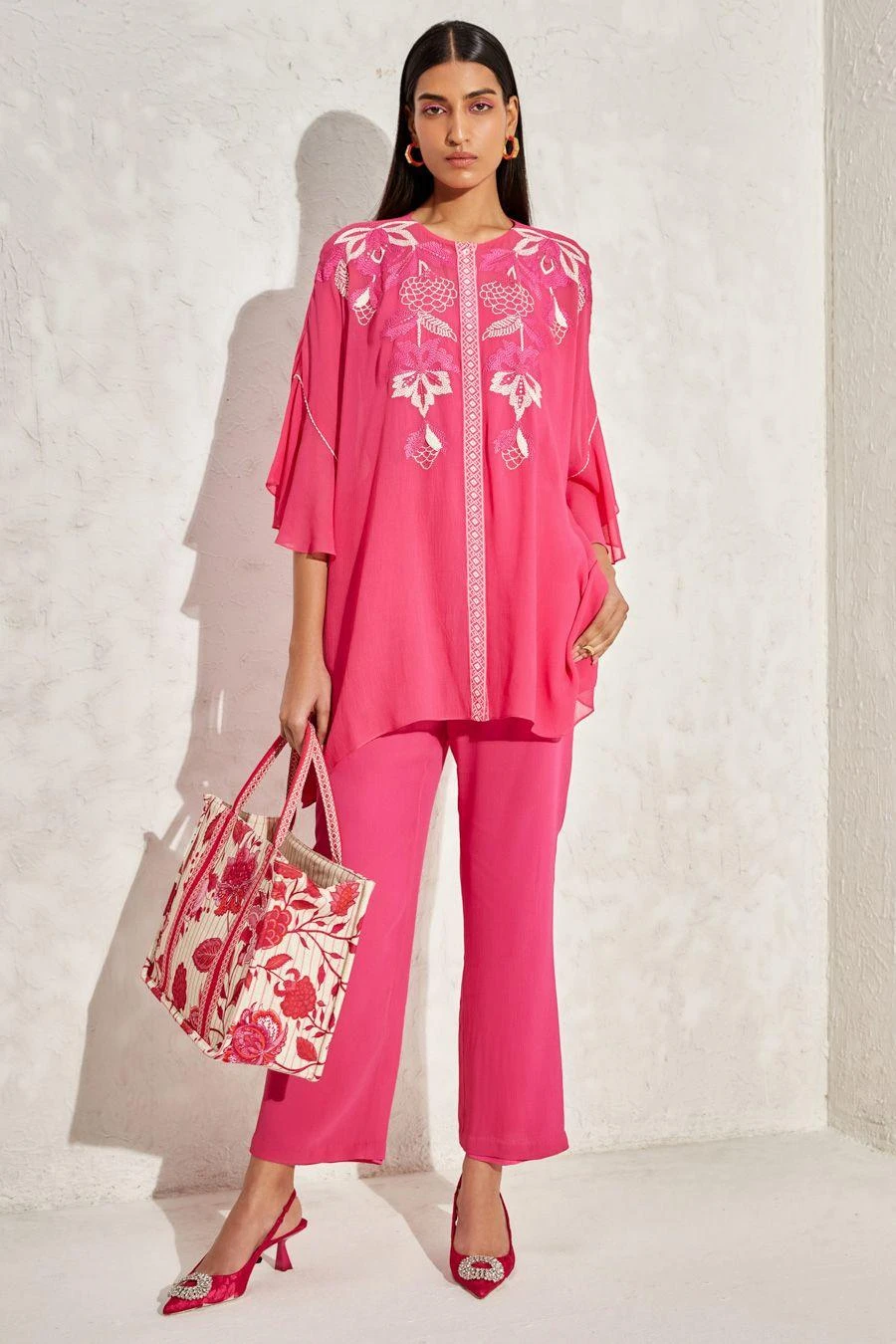 The perfect amalgamation of style & comfort, this top is perfect for a day out. Crafted in georgette, this top features floral hand embellished details. Pair this top with a pair of pink flared pants & dangler earrings to complete the look.