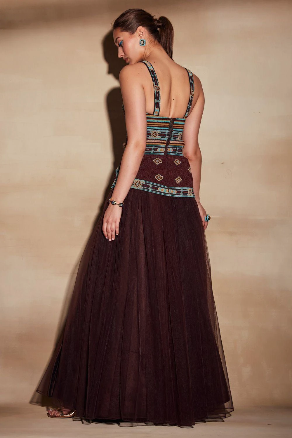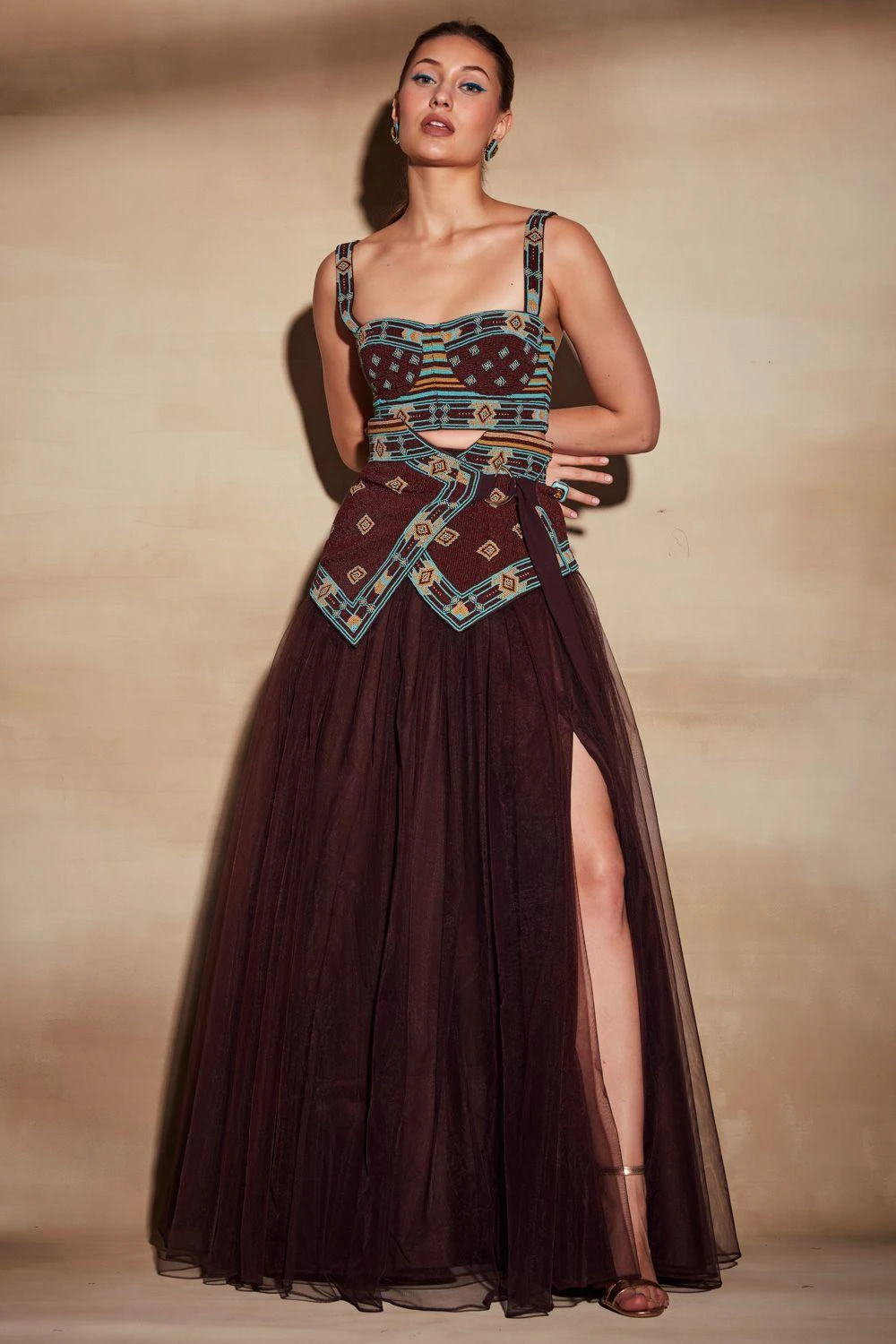 Take the center stage at your closed one’s sangeet or cocktail in this magnetic chocolate brown ensemble. It features a statement bustier in luxe suiting fabric with turkish bead embroidery and comes with a matching tulle skirt with a front slit.