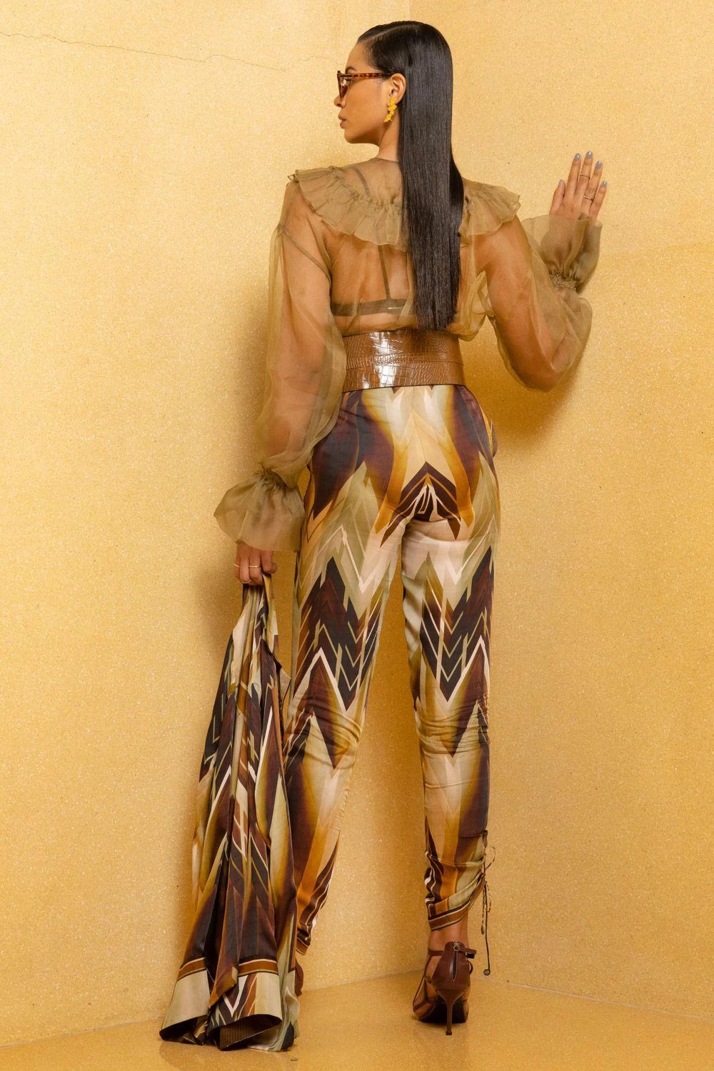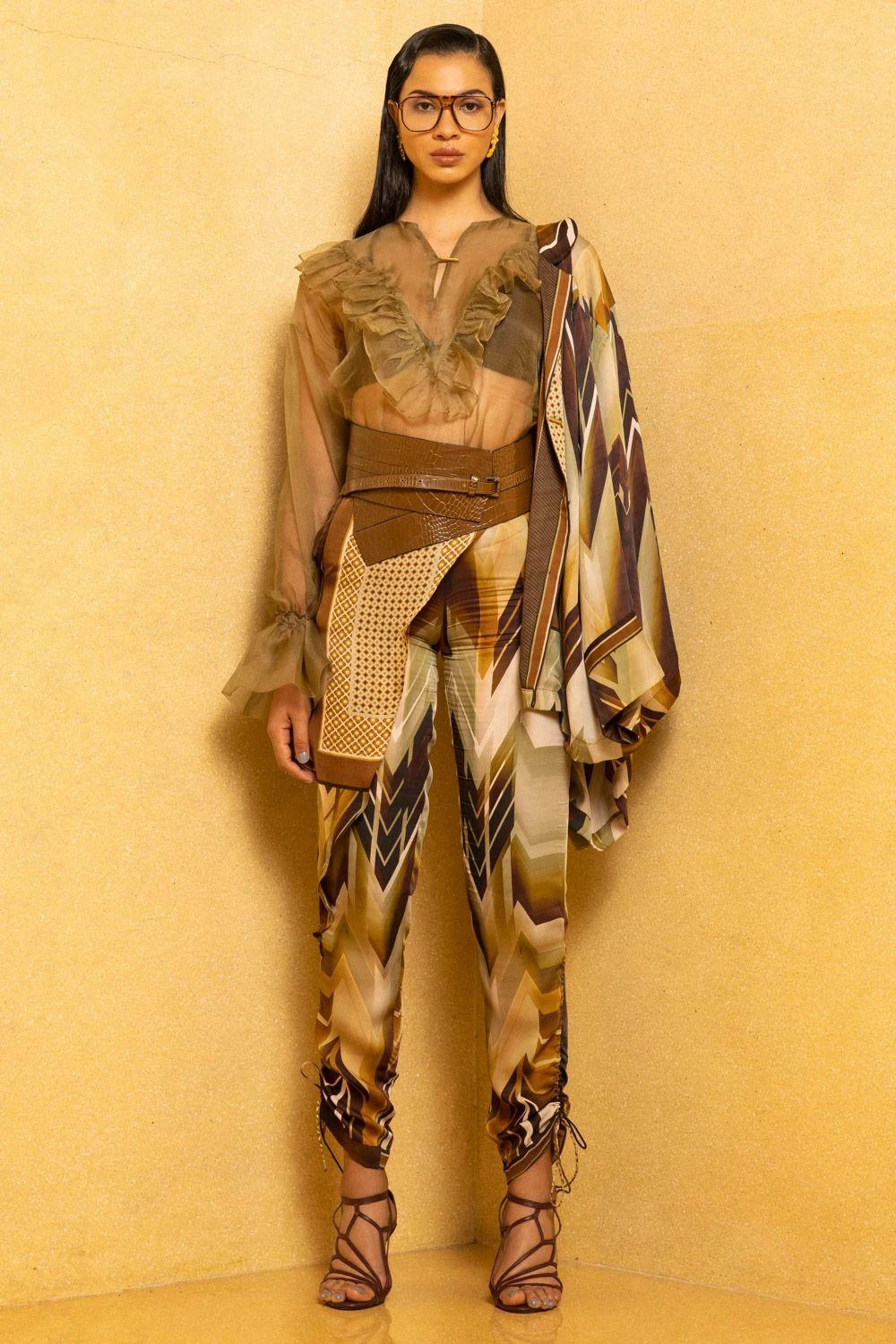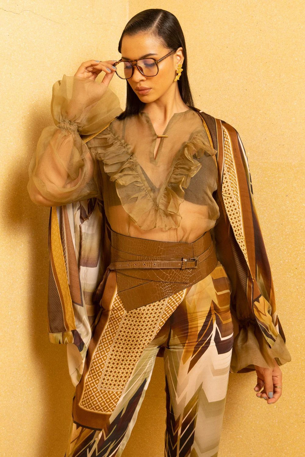 This luxe satin sundown coffee printed shirt is effortlessly cool. It is cut in a classic shirt silhouette with lapel collars. You can team it up with a pair of coordinating pants for a facile co-ord look.