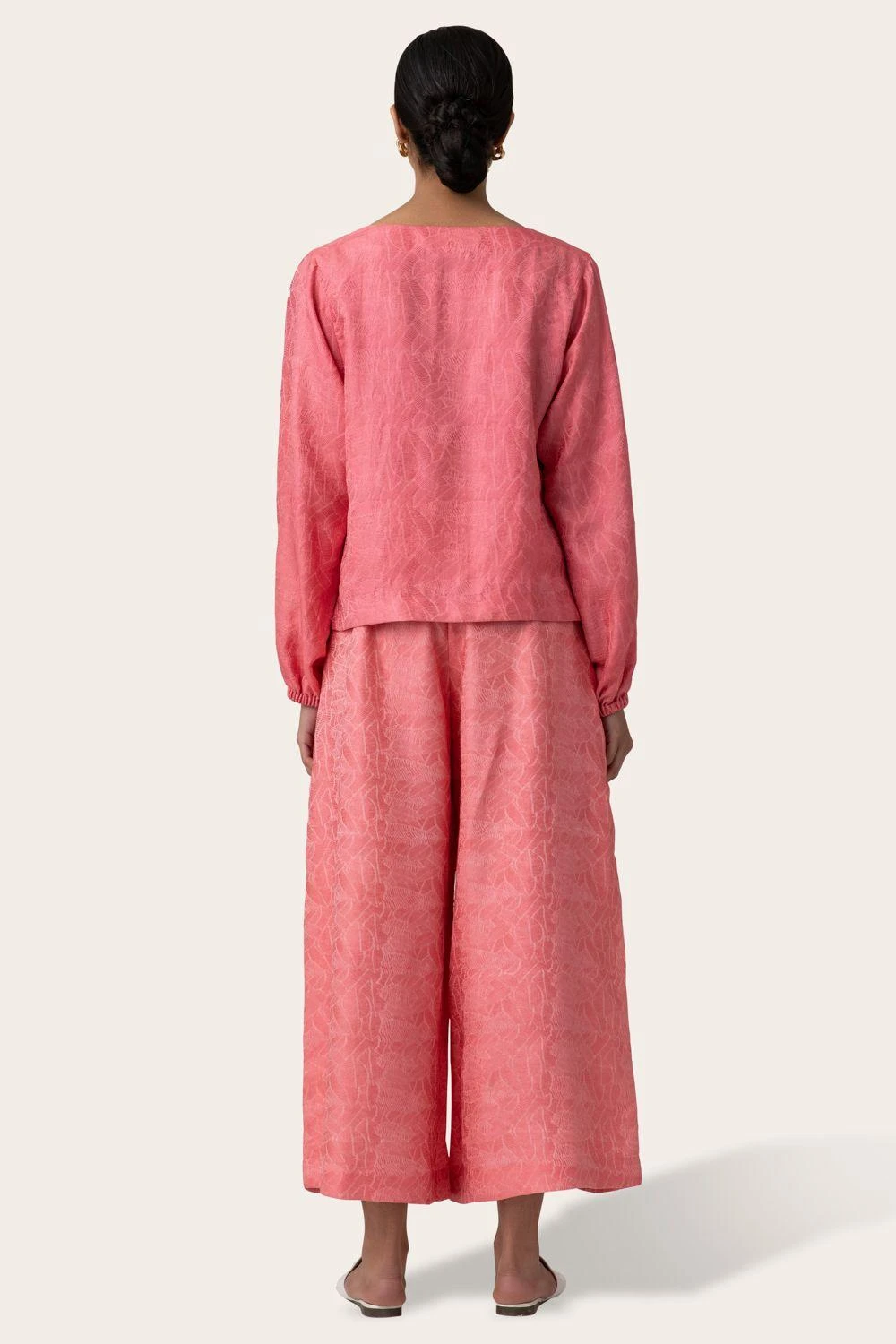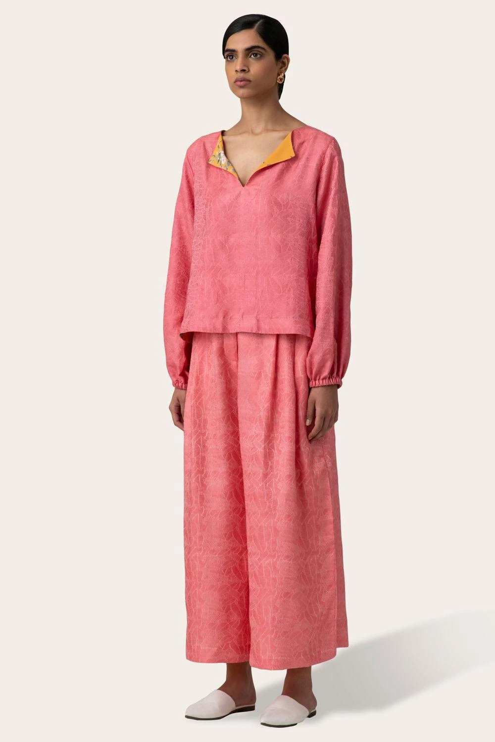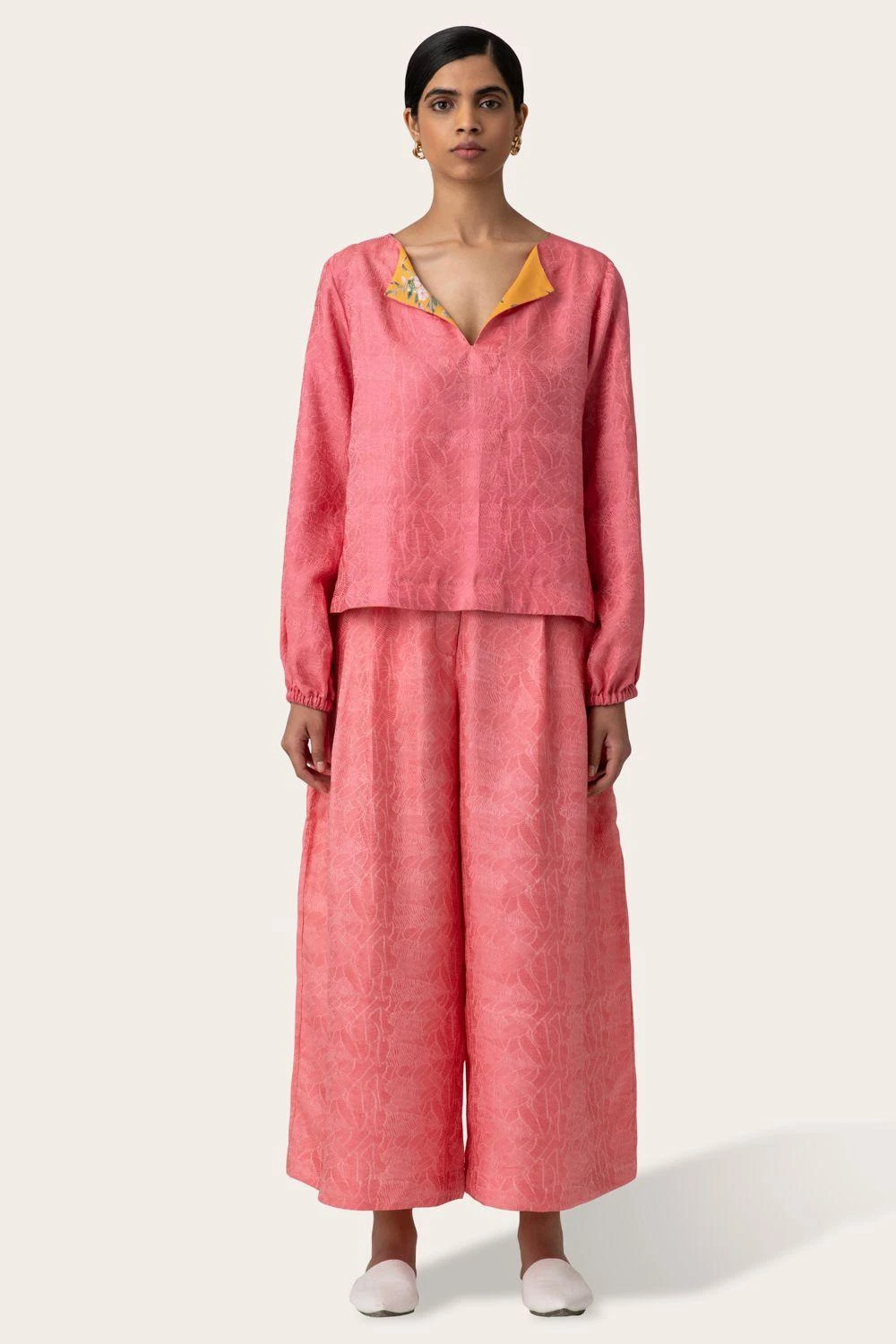 Ditch your mundane trousers for these comfortably stylish pink trousers. It is constructed with a pleated flare leg and elegant pleats. The fabric features an abstract leaf texture, handcrafted in Benares.