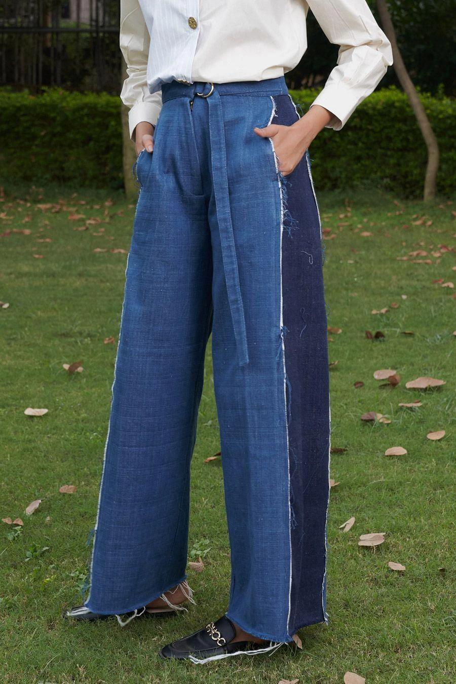These wide leg denim blue trousers in handwoven cotton denim feature colour blocking details on the side with frayed edge detail. It has a front D ring closure allowing a little room for size adjustment.
