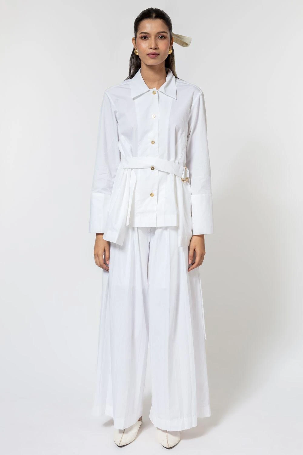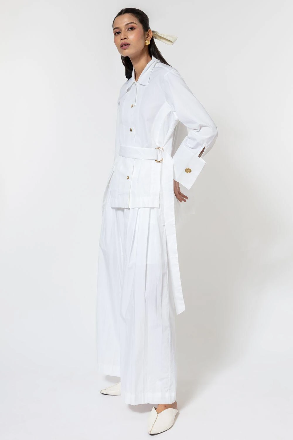 Go from day to evening in style & ease with this white asymmetric shirt. It is cut in 100% cotton poplin with front slits and D buckle fastening and also features statement cuffs with golden buttons.