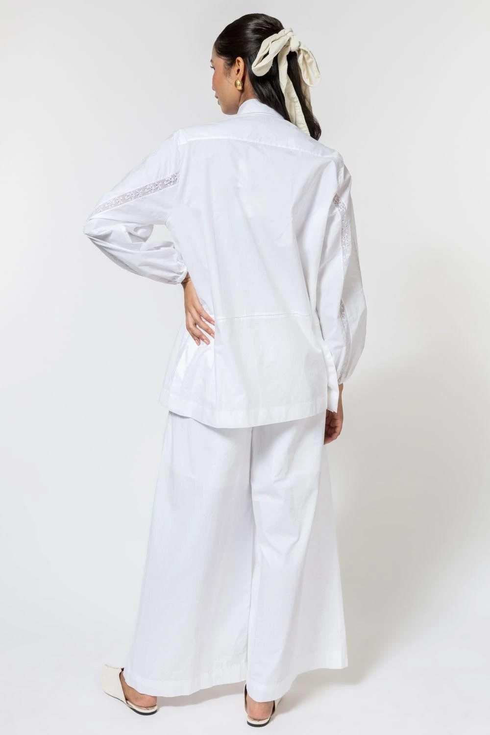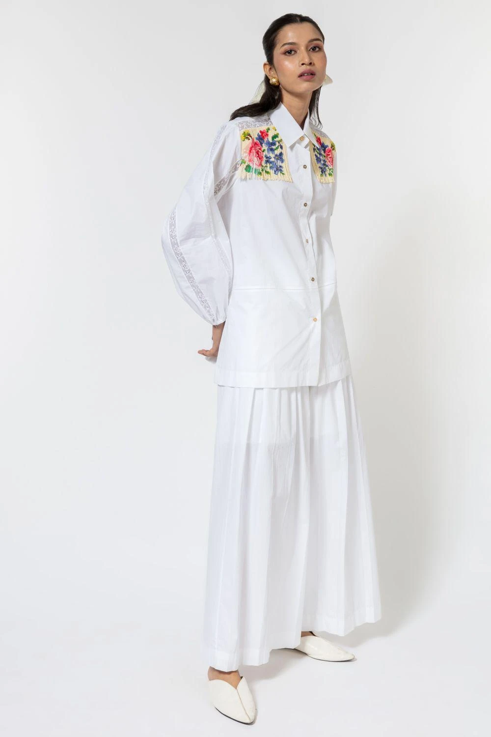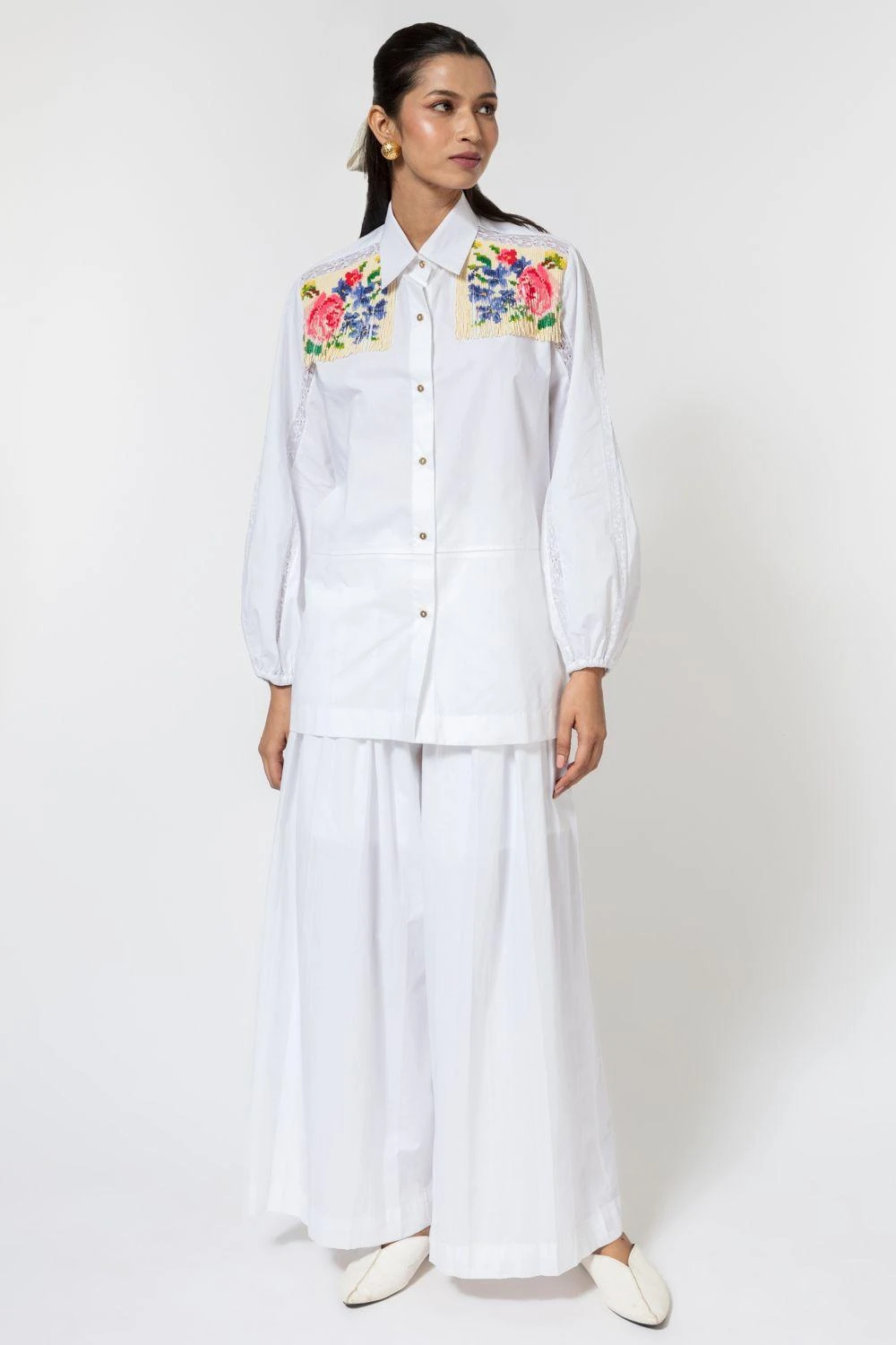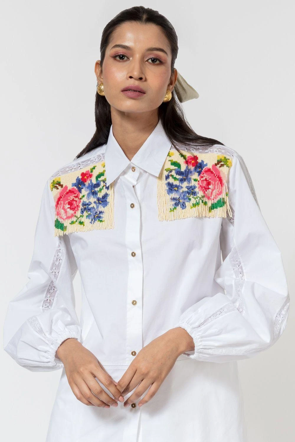 Ode to odd transports you to the floral world with this statement white shirt. It is cut in 100% cotton poplin with multi-coloured beaded tassels on the shoulder creating a floral design. It also features lace inserts on the sleeves & shoulders.