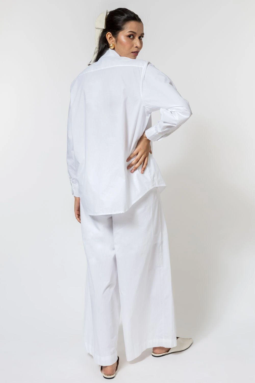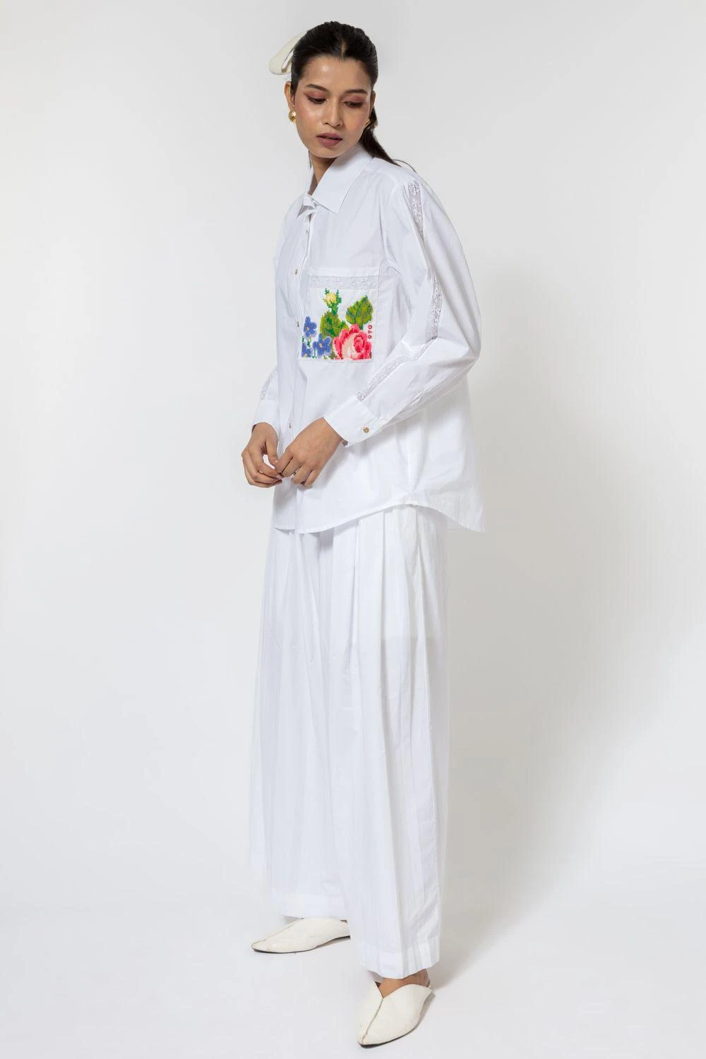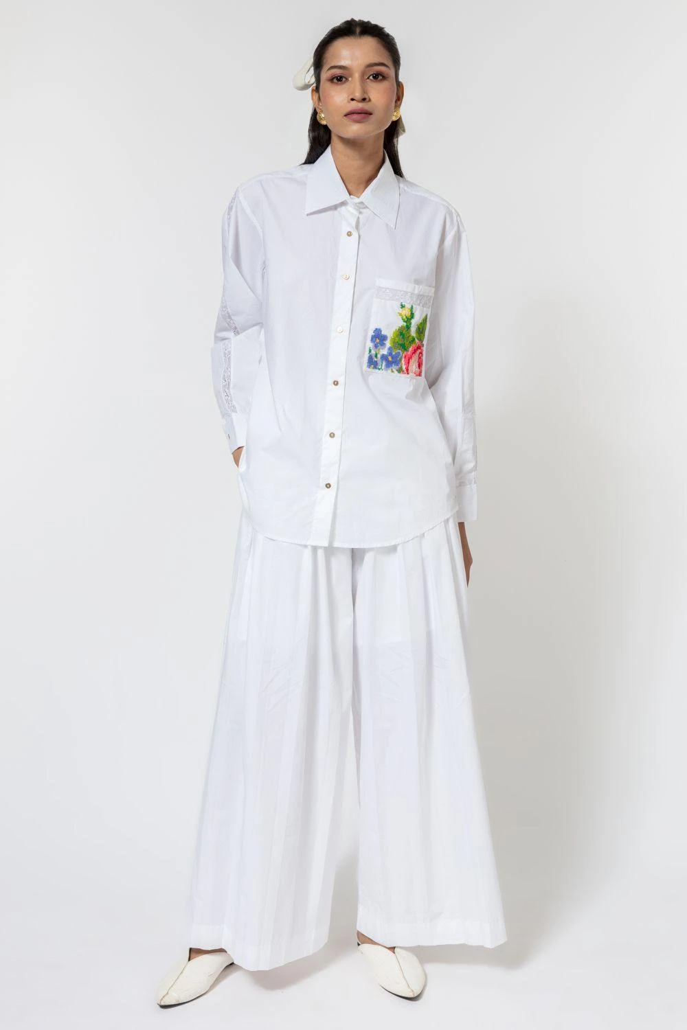 Ode to odd transports you to the floral world with this elegant white shirt. It is cut in 100% cotton poplin with hand embroidery in beads on the pocket & lace inserts on the sleeves.
