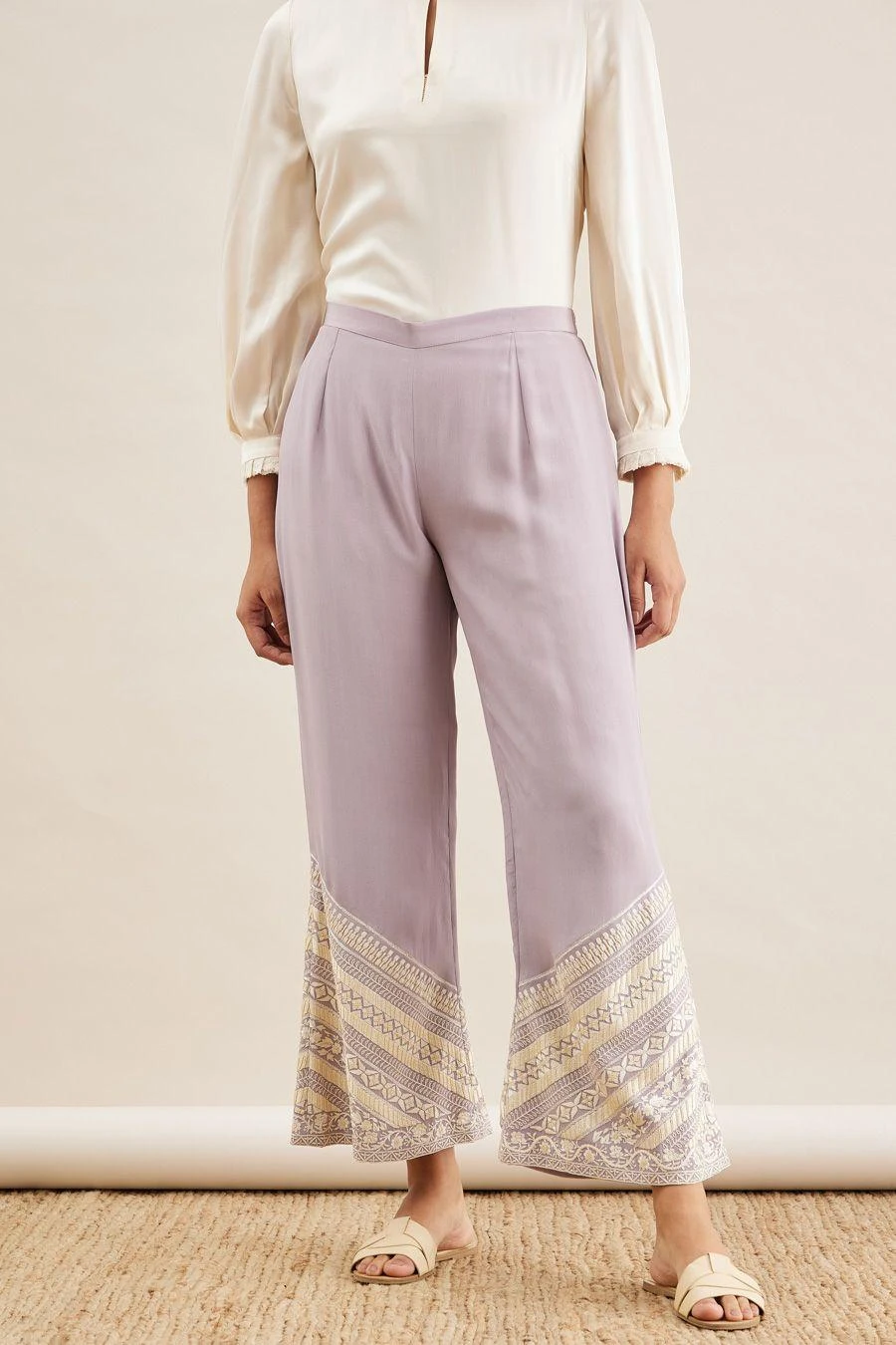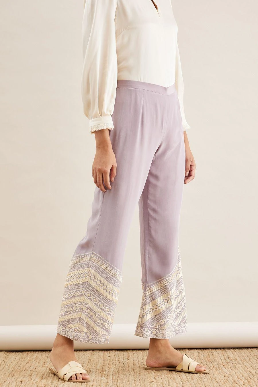 Crafted in silk crepe, these lavender pants feature navaz jaal hand-embroidered in silk threads. Style them with a white gara embroidered top from the collection to complete the set.