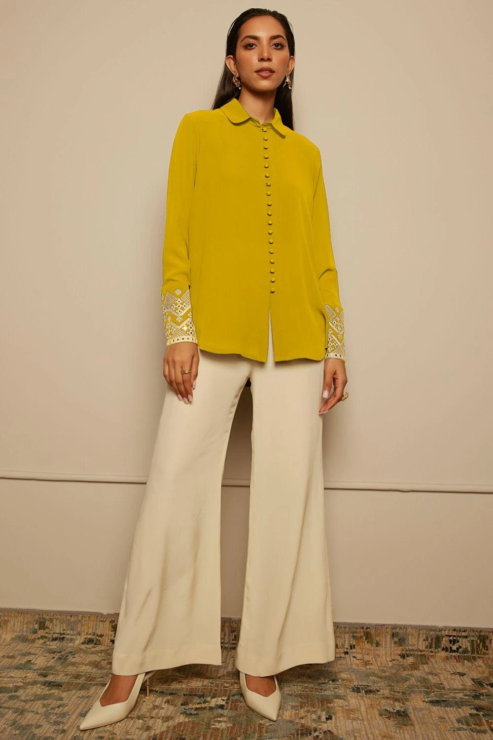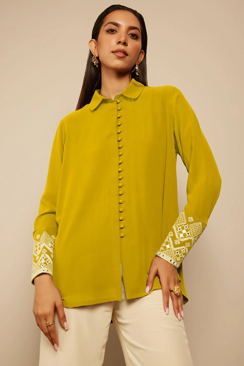 Despite its subtlety, this mustard yellow shirt ensures a high impact look. It is woven in sheen silk georgette and features intricate hand thread embroidery & mirror work on the cuffs. Style it with a pair of coordinating pants.