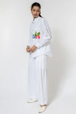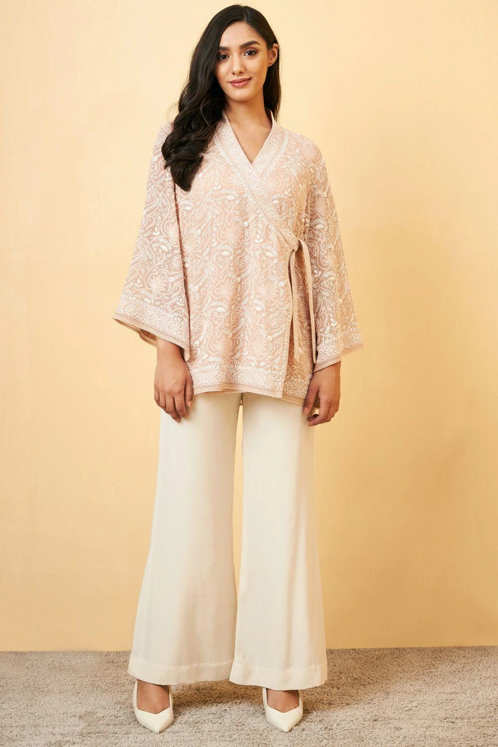 This peach top fetaures a wrap detail, and is crafted in hand embroidered chikankari with sequins in pure silk georgette. Pair this top with a pair of white trousers and dainty jewellery to complete the look.