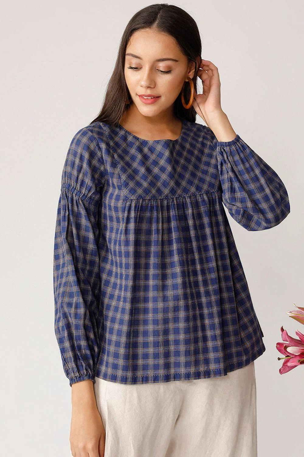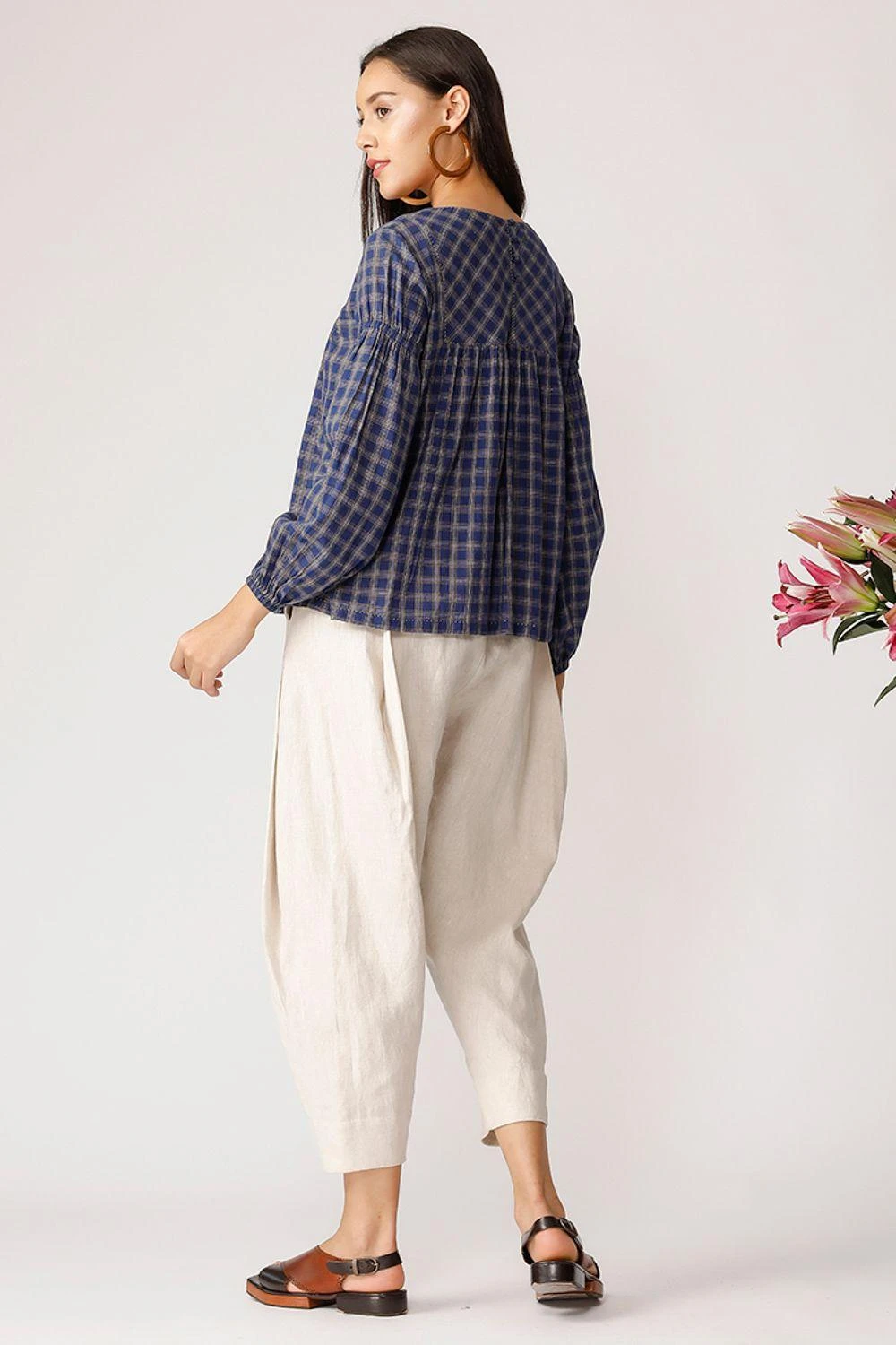 This elegant navy blue shirt is cut in a handloom cotton. Style this versatile top with fitted or loose fit pants for a chic summer daytime look.