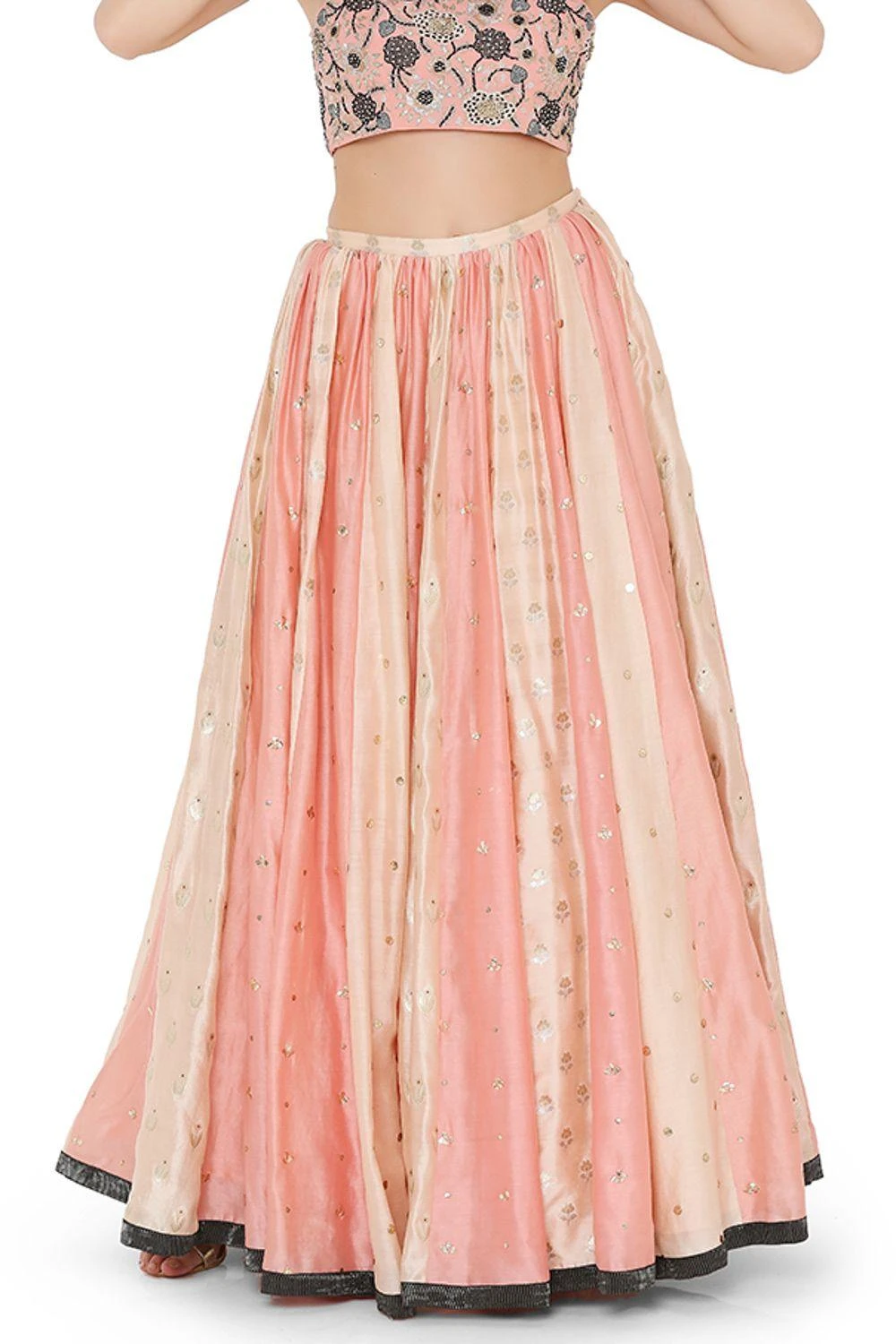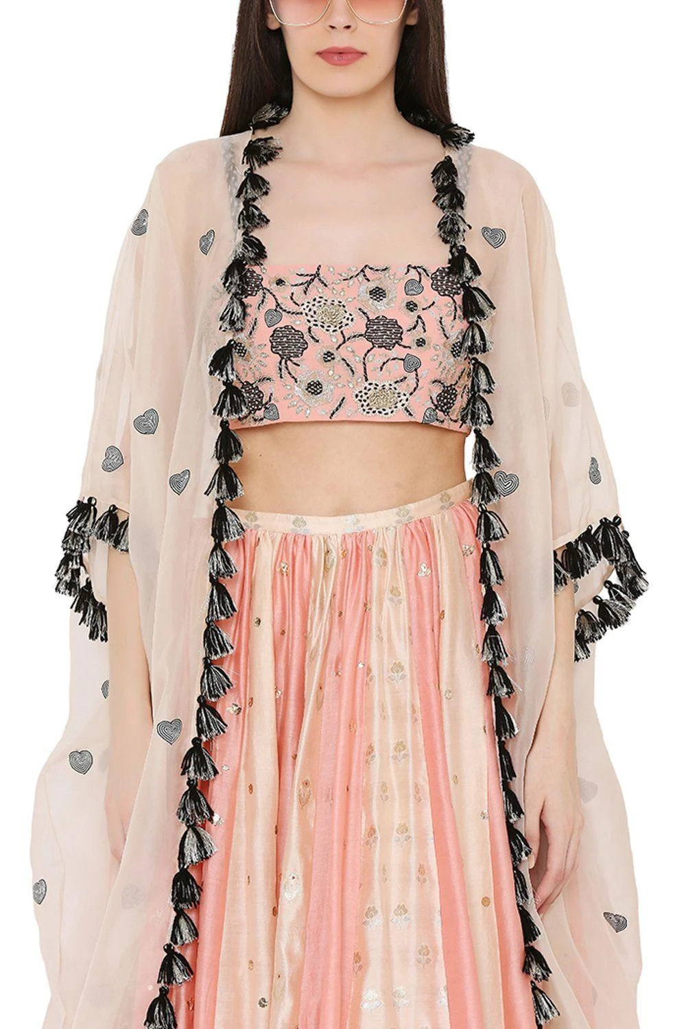 This coral lehenga set is set in a banarasi brocade. The embroidered bustier & net cape add a romantic elegance to the look.Style this dreamy set for daytime wedding functions.