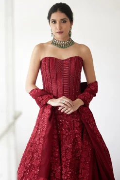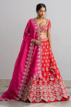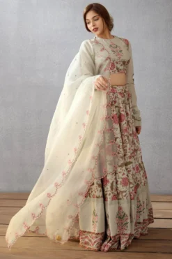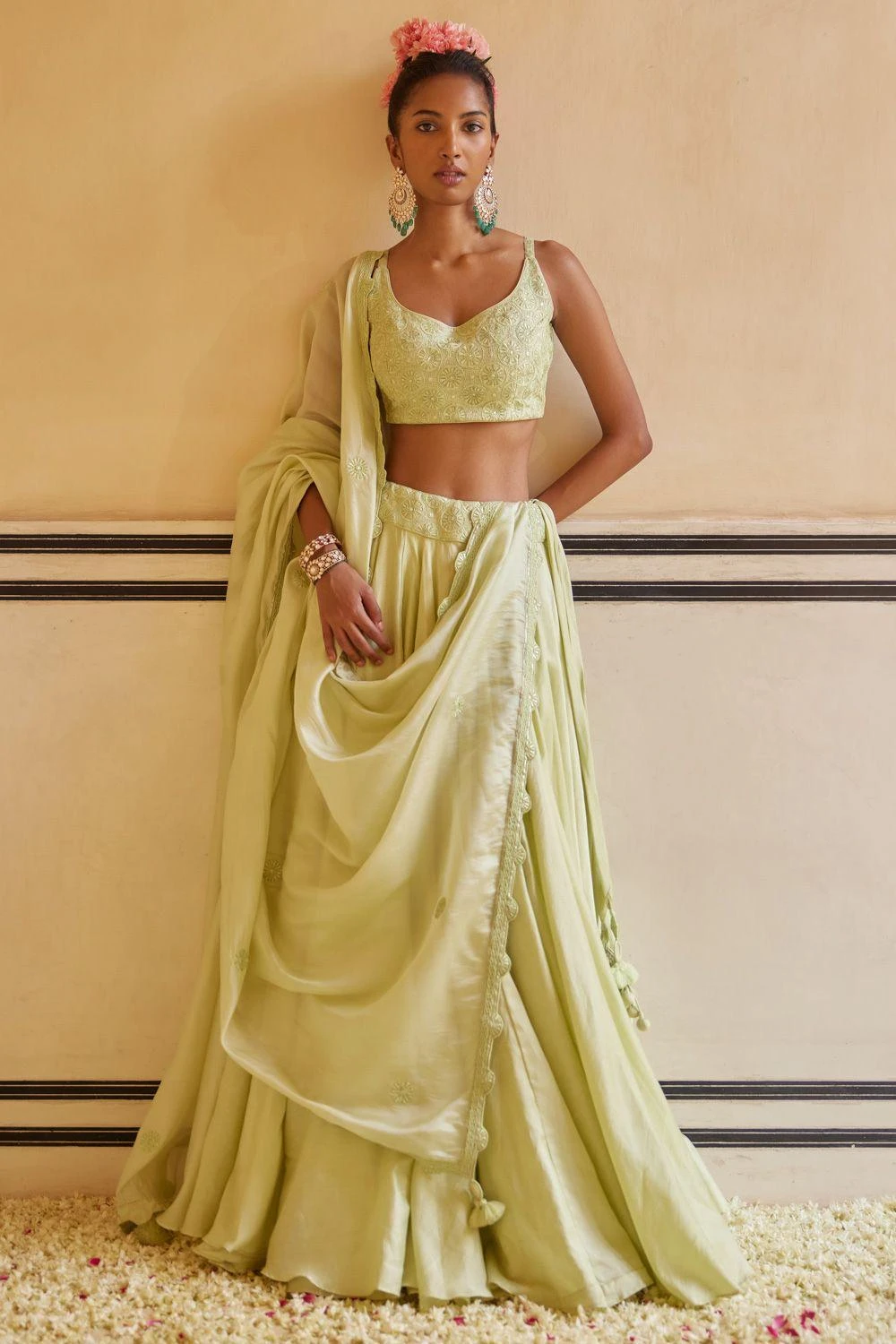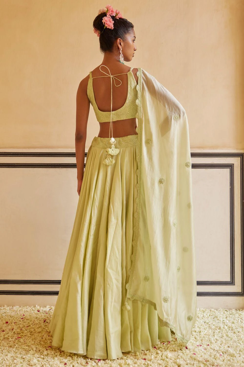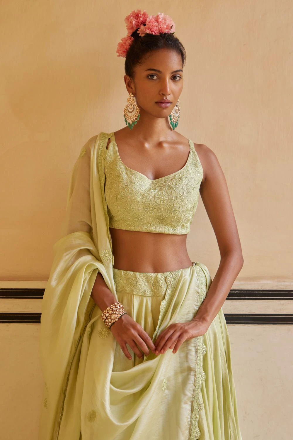 Look effortlessly stylish with this lehenga set. Crafted in chanderi silk, this set features a resham embellished lehenga paired with a sleeveless blouse & dupatta. Add a pair of statement earrings to complete the look.